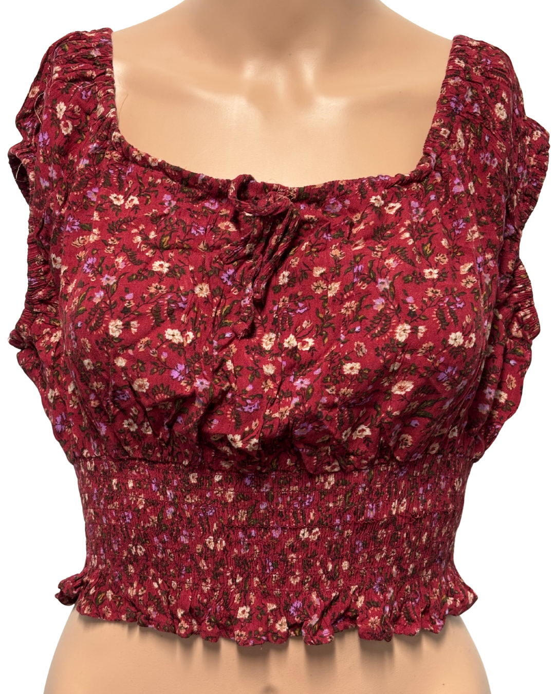 American Eagle Maroon Floral Smocked Ruffle Crop Top