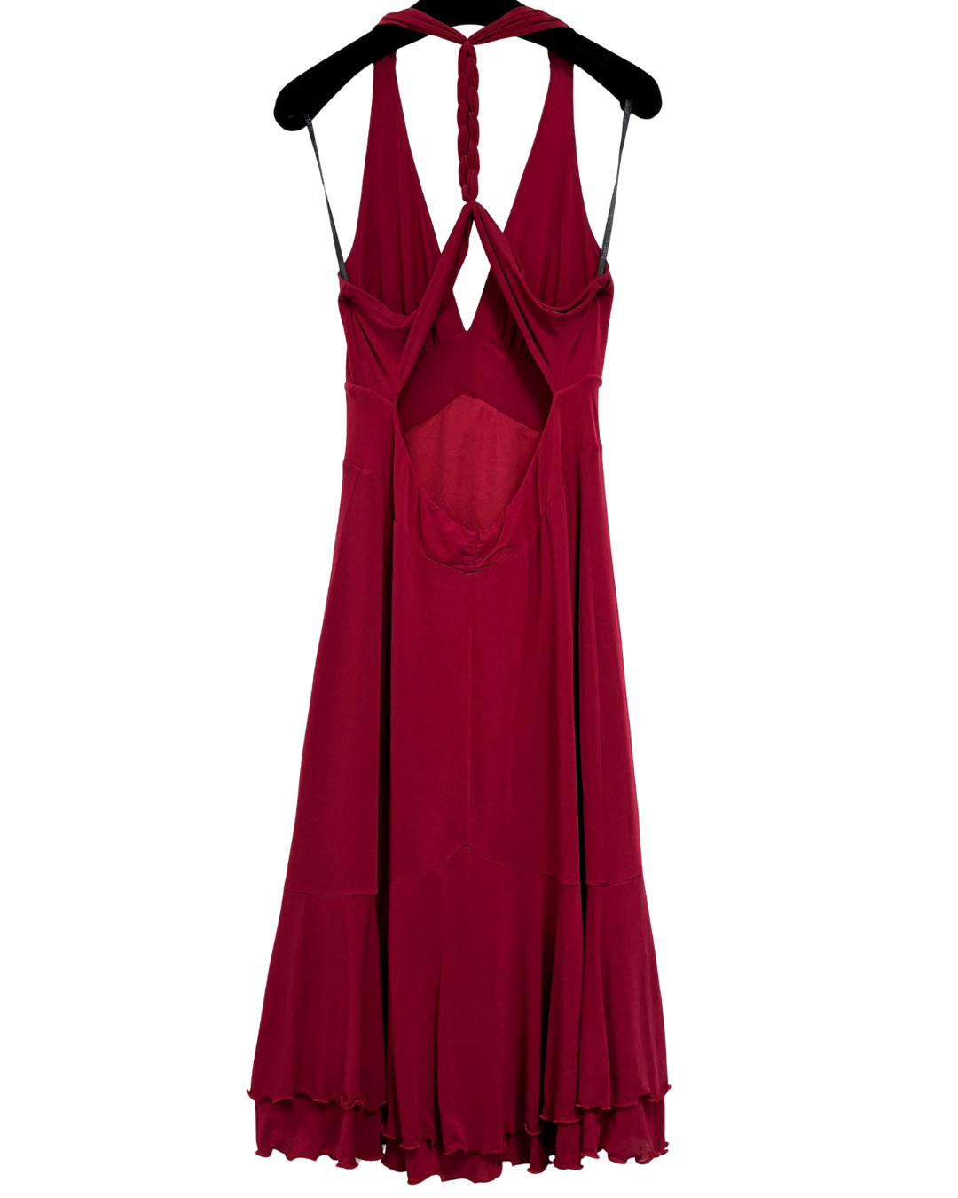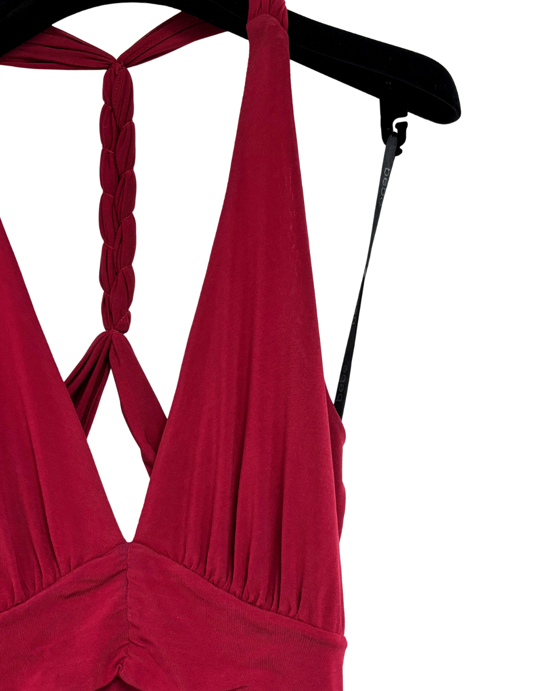 Bebe Y2K Red Braided Halter Open Back & Ruffle Hem Midi Dress