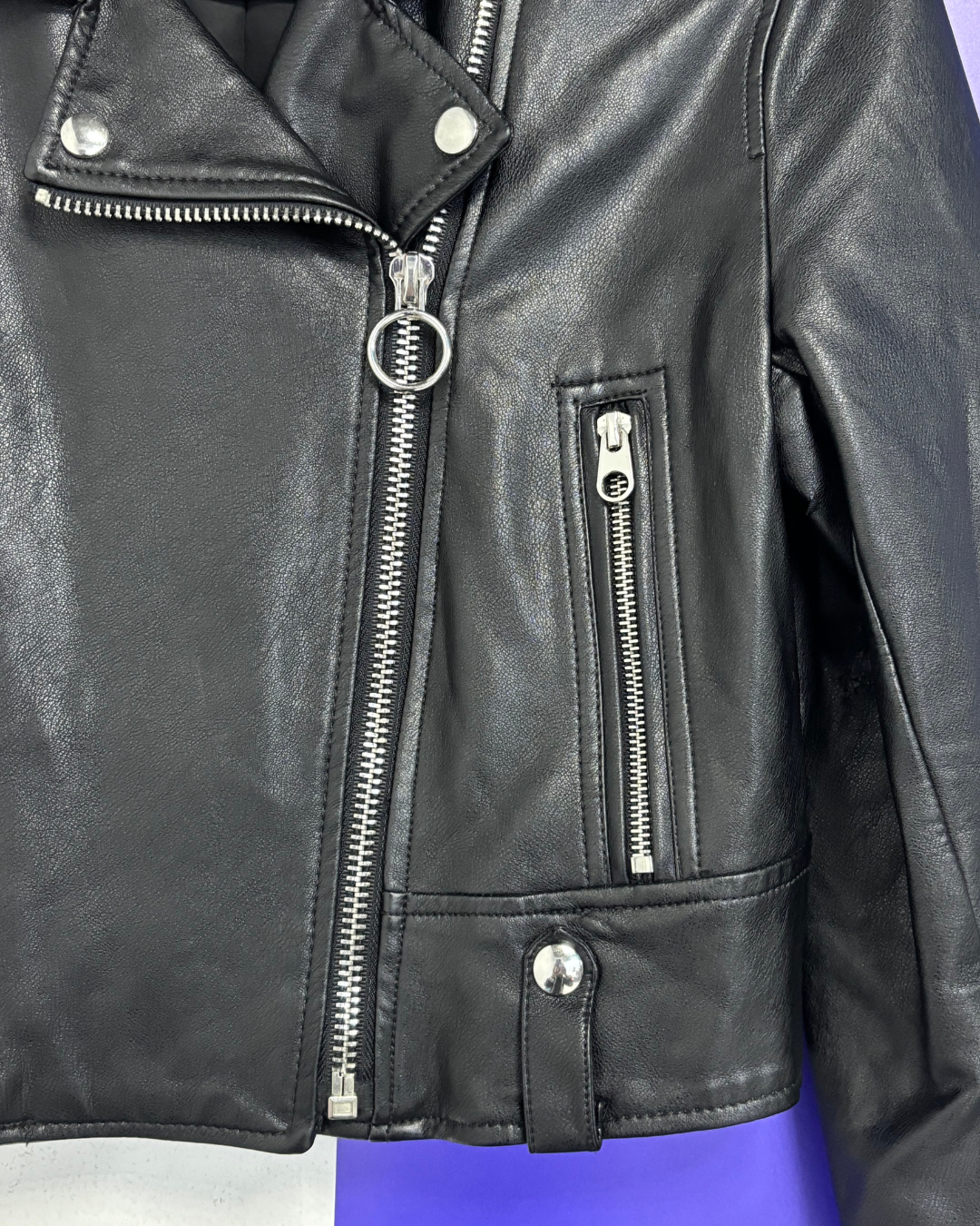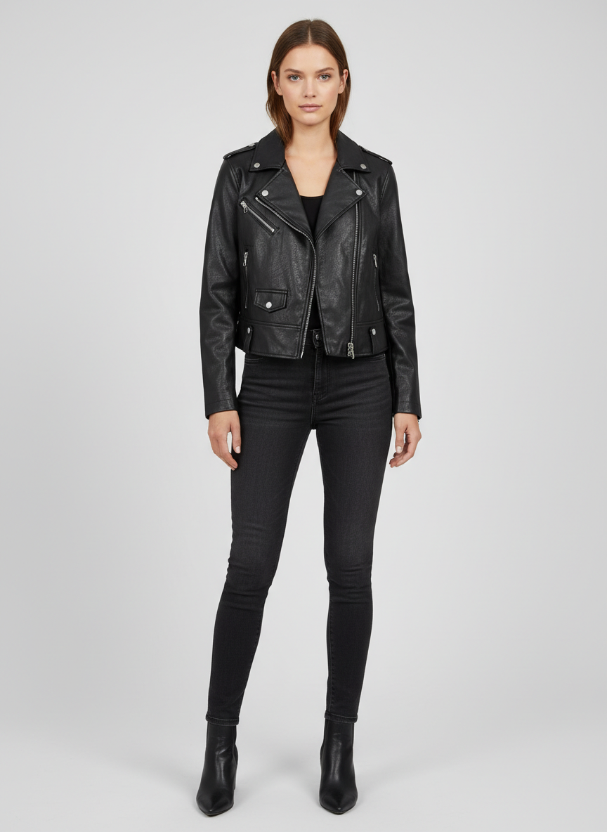 Elevate your edgy style with this classic cropped biker jacket. Crafted from high-quality synthetic leather with a subtle grain texture,... Read more