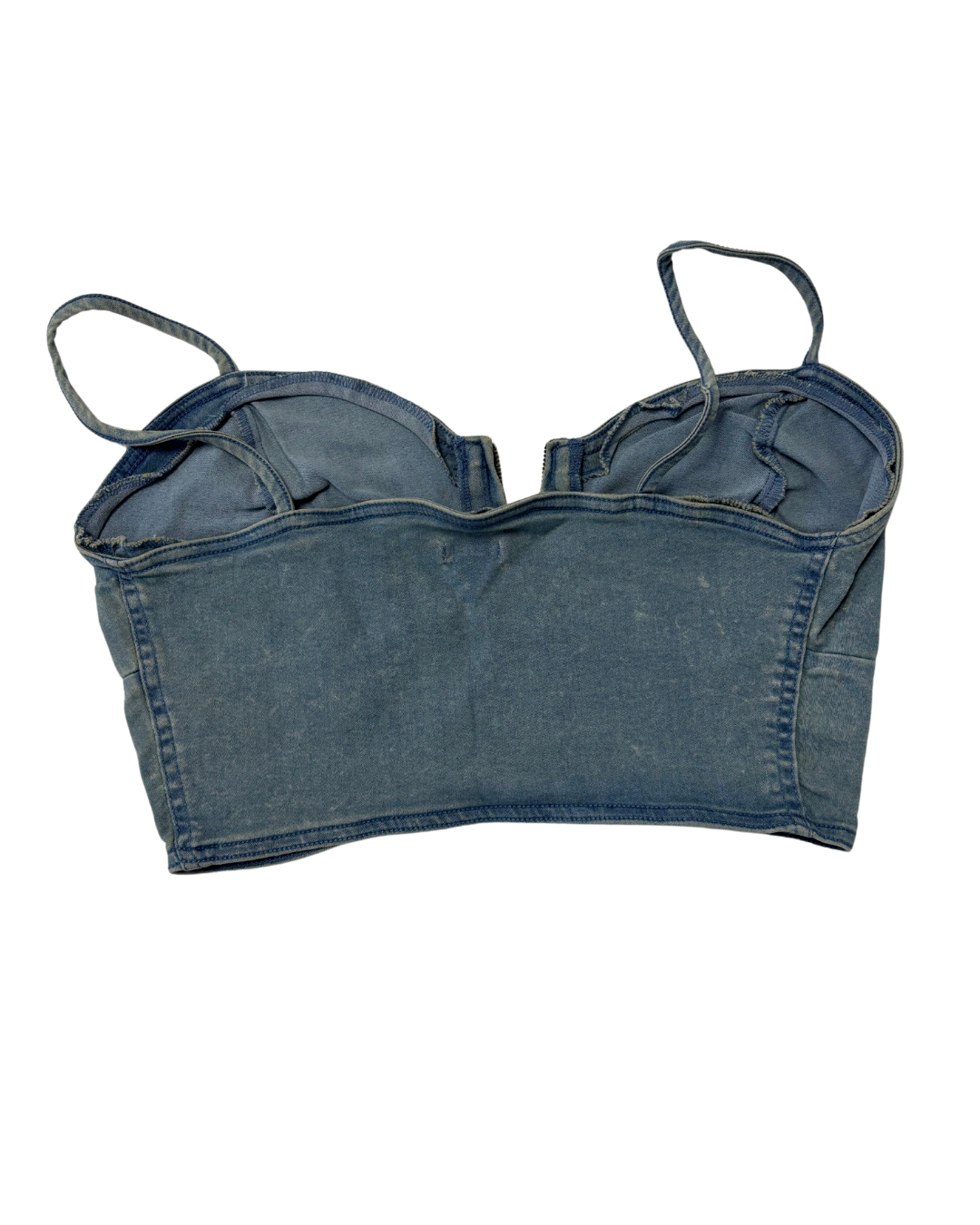 Product form Bongo Blue Denim Zip-Front Bustier Crop Top - XS Measurements:Pit to Pit: 16Length: 10 Brand Size: L Dhs35.00 Quantity Add to cart Washed & Ready to WearFree shipping on all orders above 100 AEDNext day delivery