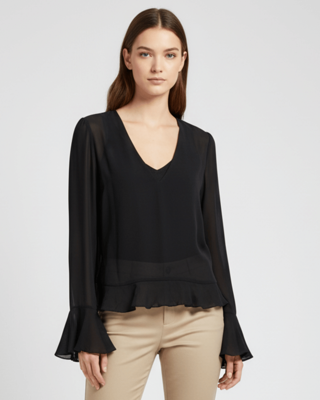 CHAPS Black Sheer Mesh Ruffle Bell Sleeve Peplum Blouse