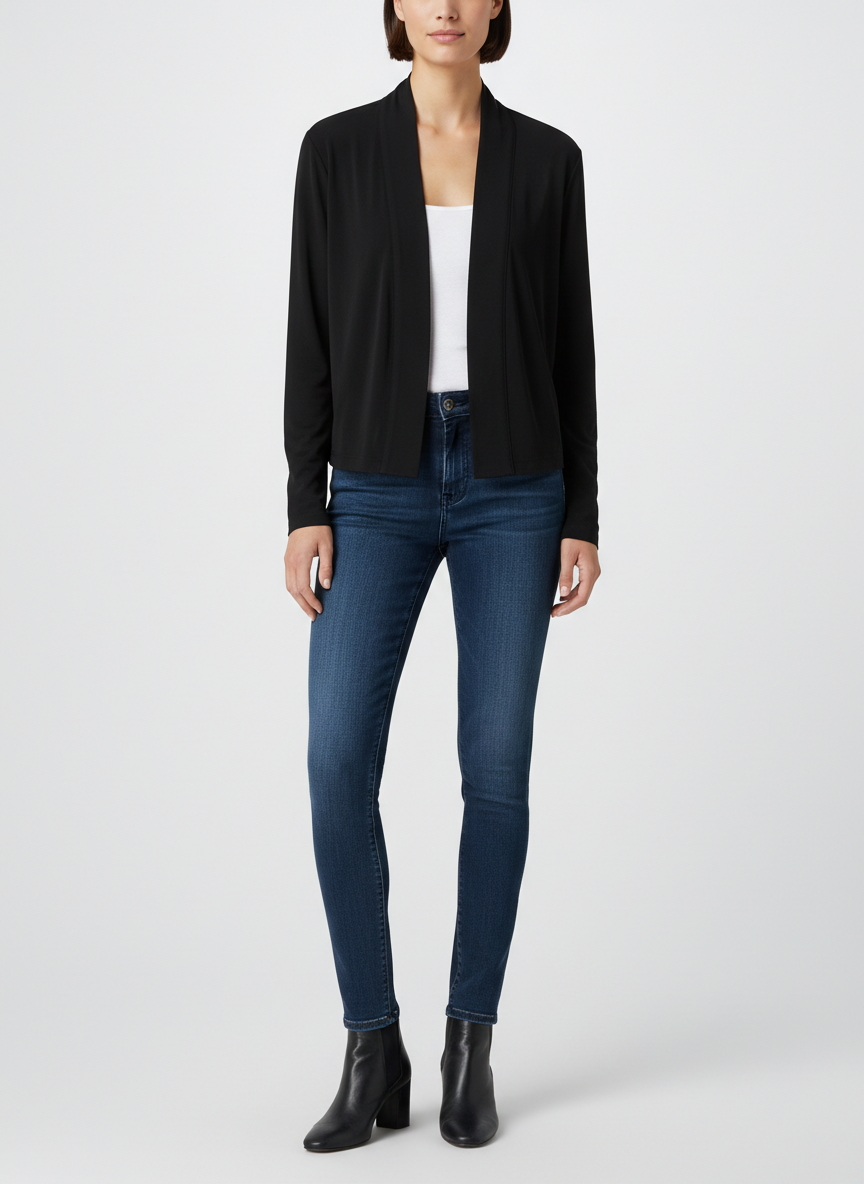 Elevate your layering game with this sophisticated open-front shrug. Designed with a clean, cropped silhouette and a soft-touch drape, it... Read more