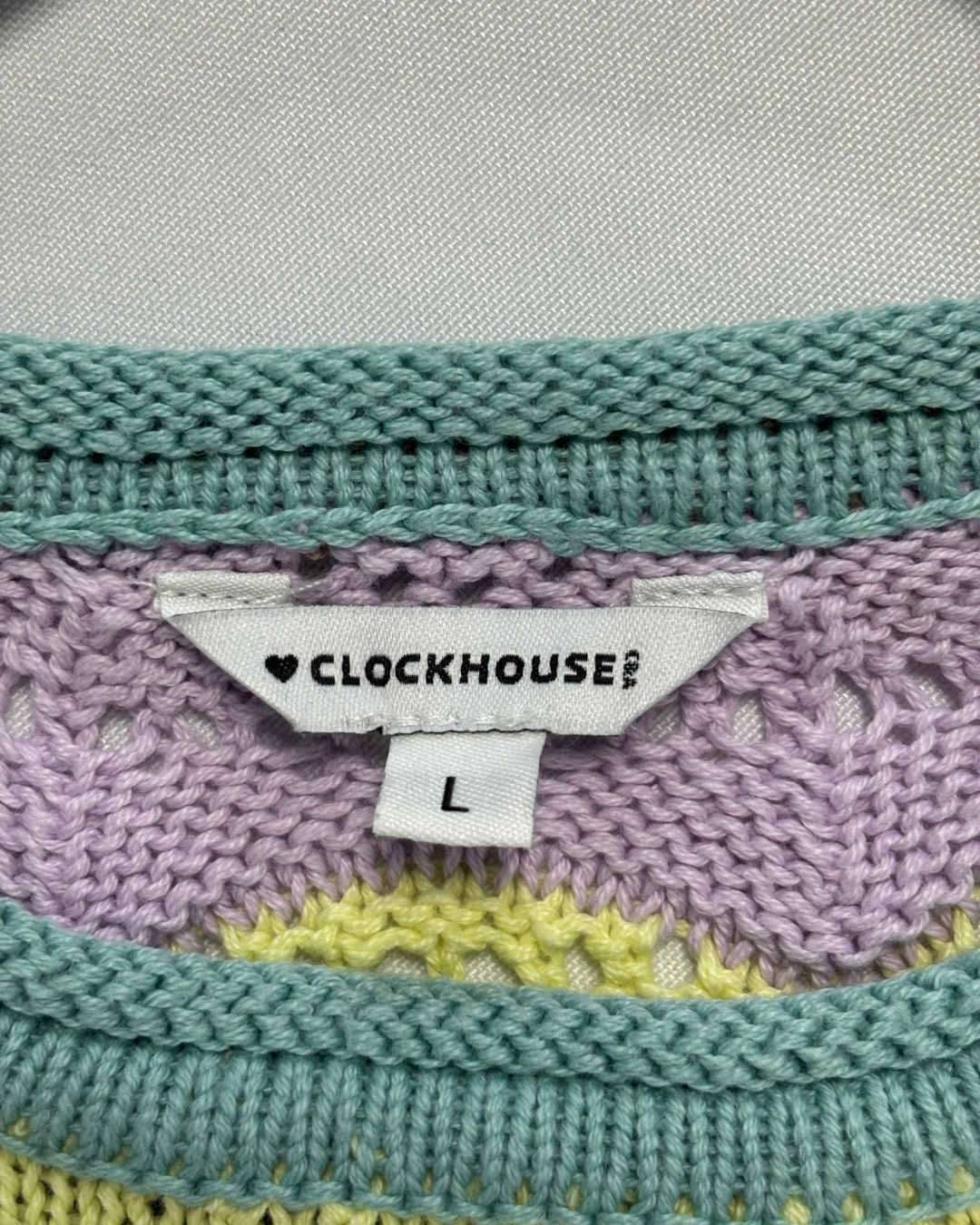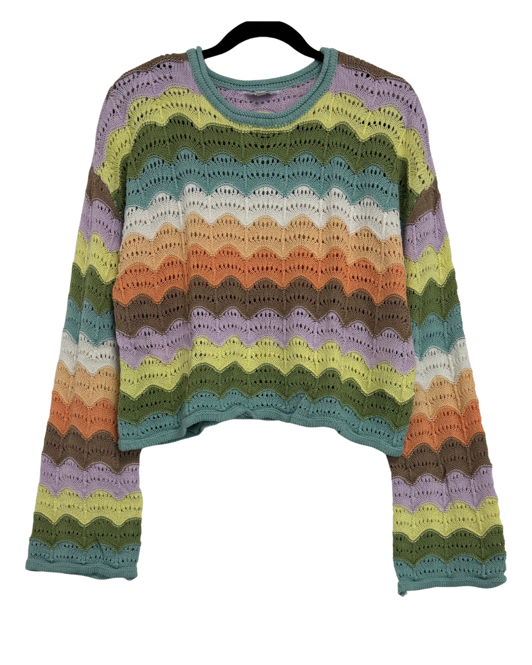 Clockhouse Pastel Rainbow Wavy Crochet-Style Pullover Knit Sweater – L