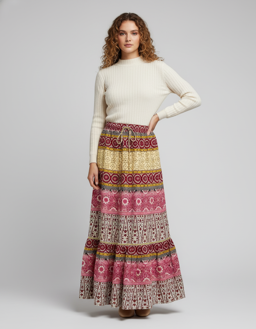 Make a bold bohemian statement with this Cynthia Rowley multi-color tiered maxi skirt. Featuring intricate floral and tribal-inspired prints in... Read more