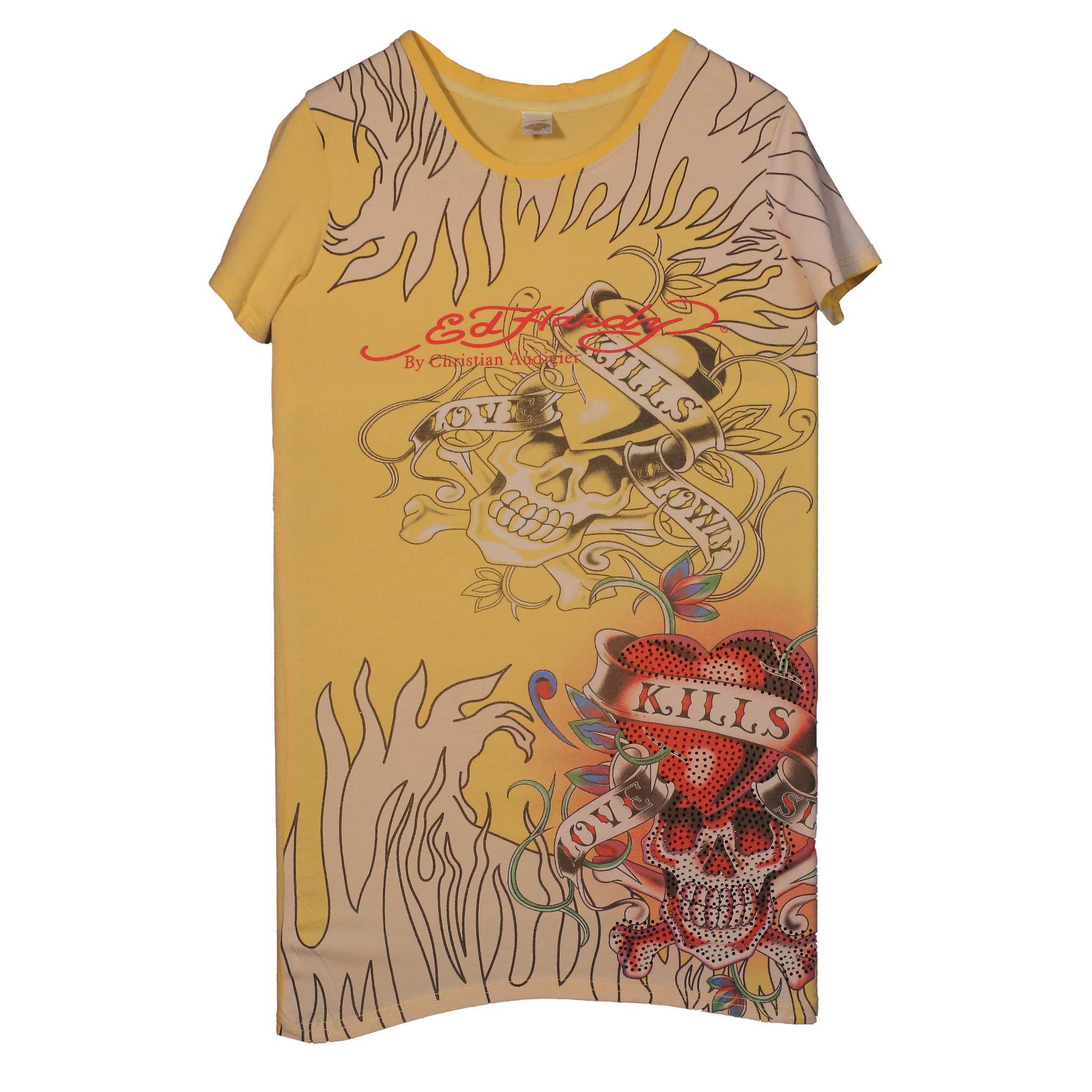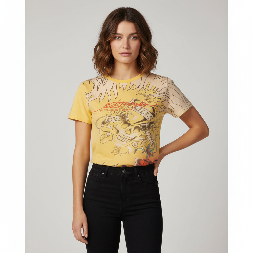 Bring back the boldness of early 2000s fashion with this Ed Hardy vintage tee, showcasing a striking tiger head graphic in signature retro style. The vibrant yellow base commands attention while the intricate artwork delivers the rebellious edge that defined the era. Crafted from quality cotton for lasting comfort and color retention, this piece celebrates maximalist design and fearless self-expression. A collector's essential for anyone who refuses to blend in and embraces statement-making style.