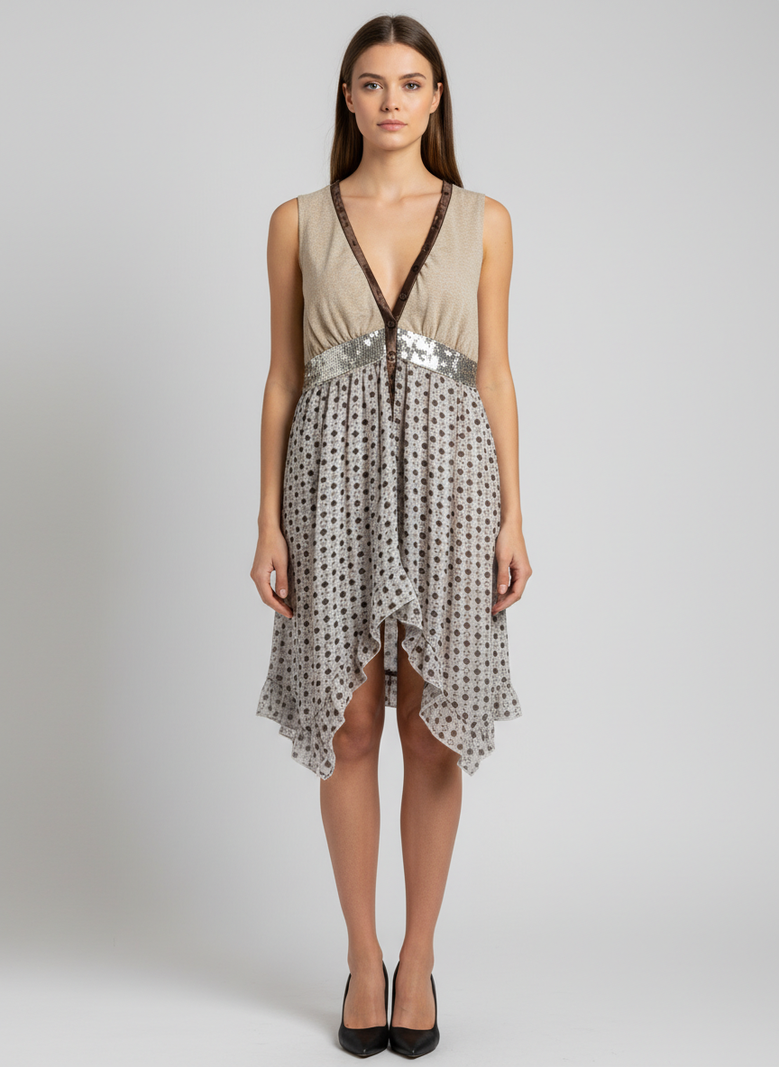 Fracomina Sleeveless Metallic Knit and Sequin Chiffon Mini Dress