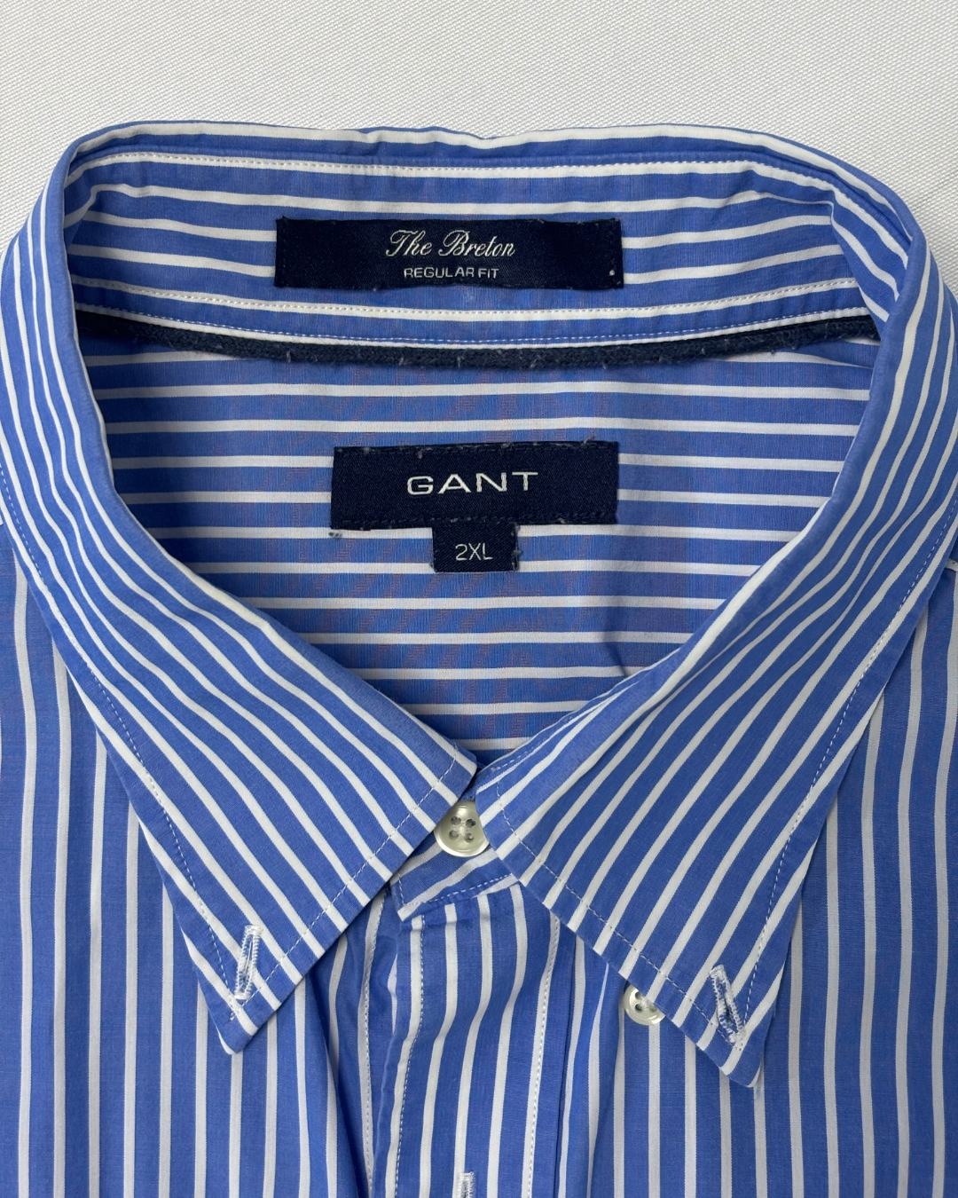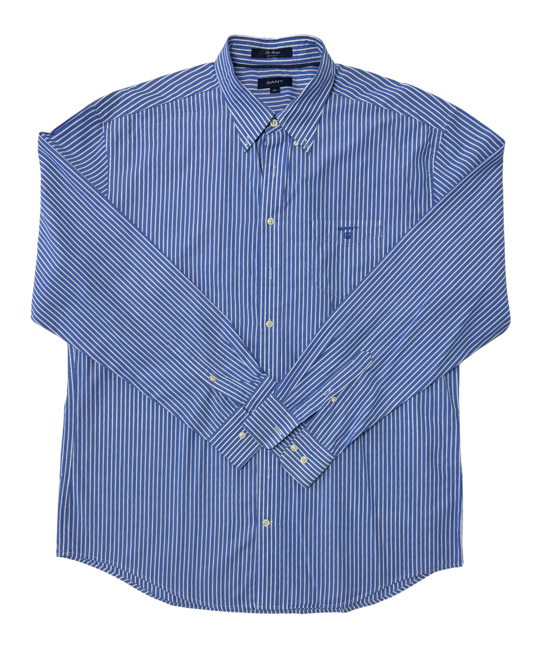 Product form GANT The Breton Regular Fit Blue & White Striped Shirt Measurements (inches) Pit to Pit: 25Length: 31.6 Brand Size: XXL Dhs40.00 Quantity Add to cart Washed & Ready to WearFree shipping on all orders above 100 AEDNext day delivery