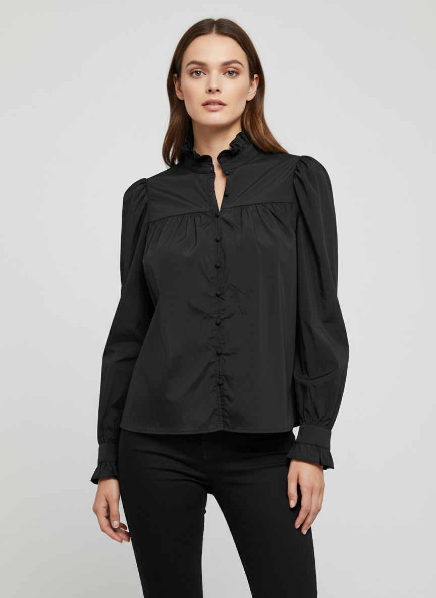 This elegant blouse features a sophisticated high ruffle collar and a delicate button-down front, creating a timeless and feminine silhouette.... Read more
