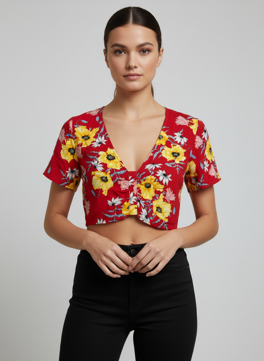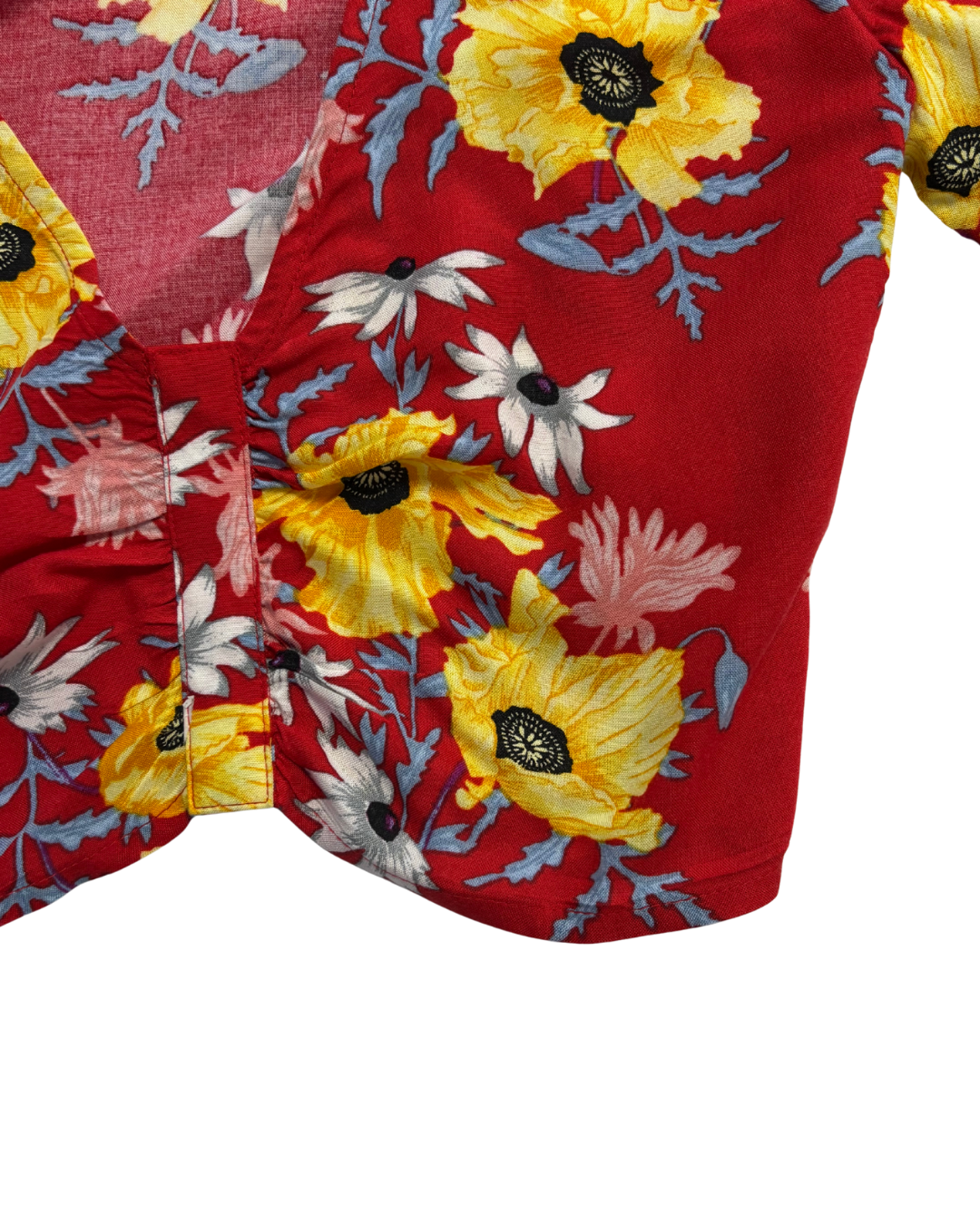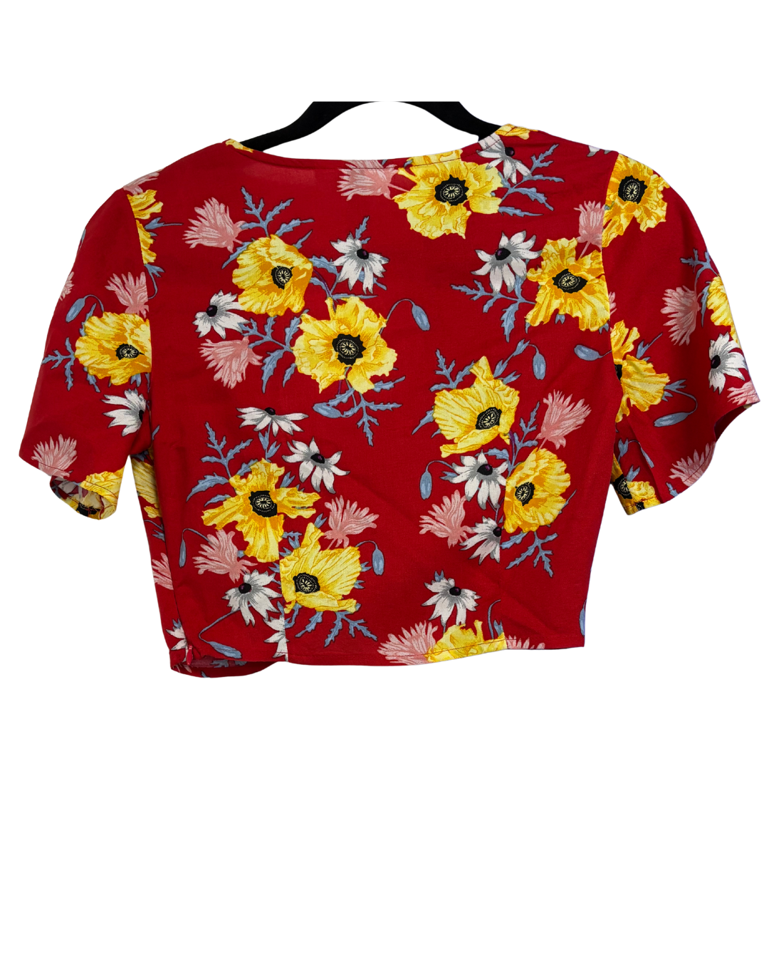 H&M Red Floral Button-Up Short Sleeve Crop Top