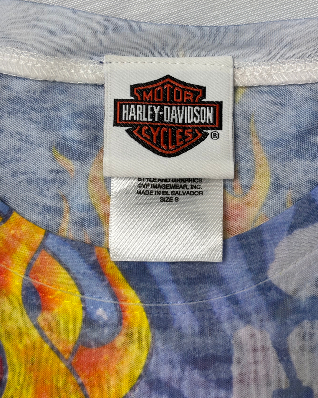 Harley-Davidson Y2K Blue All-Over Flaming Rose Tattoo Print Fitted T-Shirt