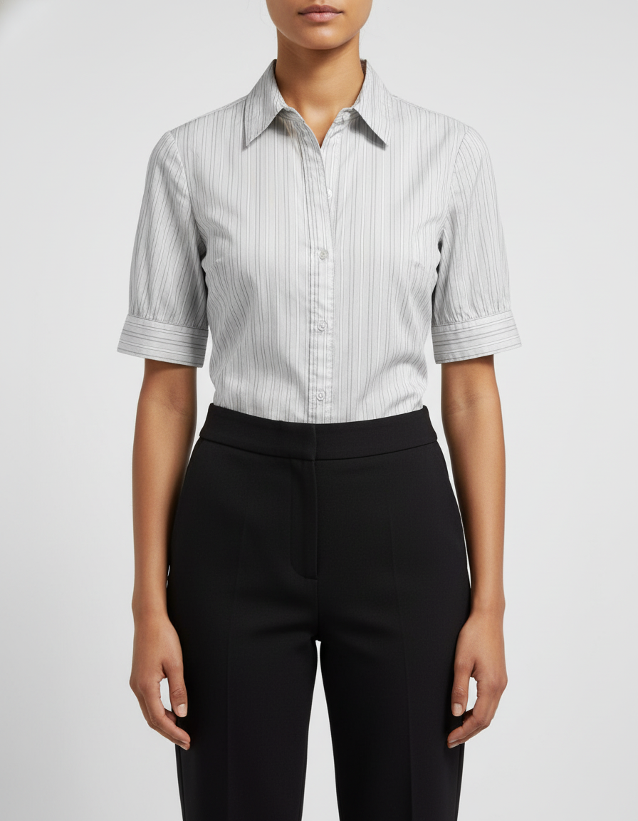 Upgrade your smart-casual game with this fitted short-sleeve pinstripe shirt from Jacob. With a crisp collar, flattering darts, and cuffed... Read more