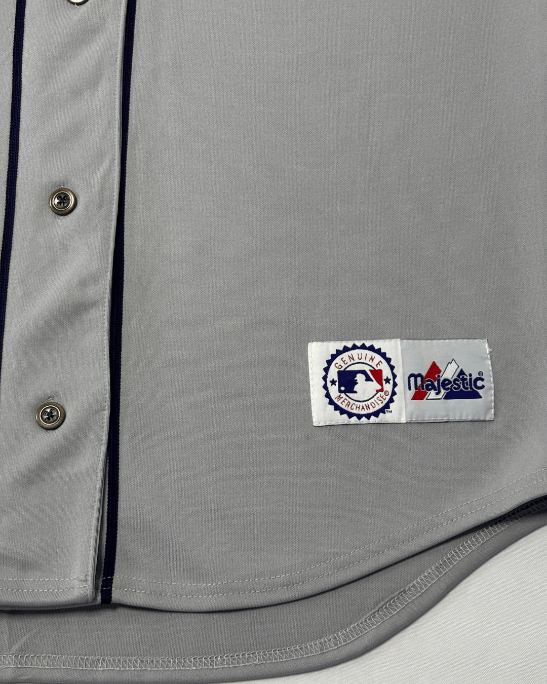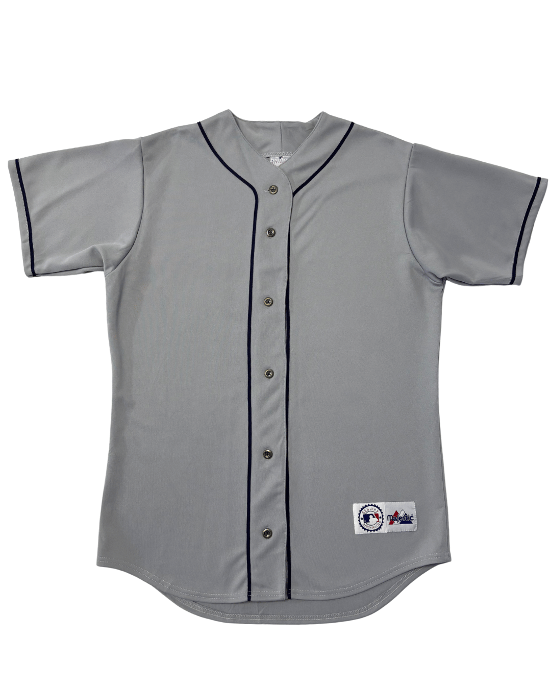 Authentic Majestic MLB grey baseball jersey featuring a clean button-up front and navy blue piping details. Crafted for comfort and... Read more