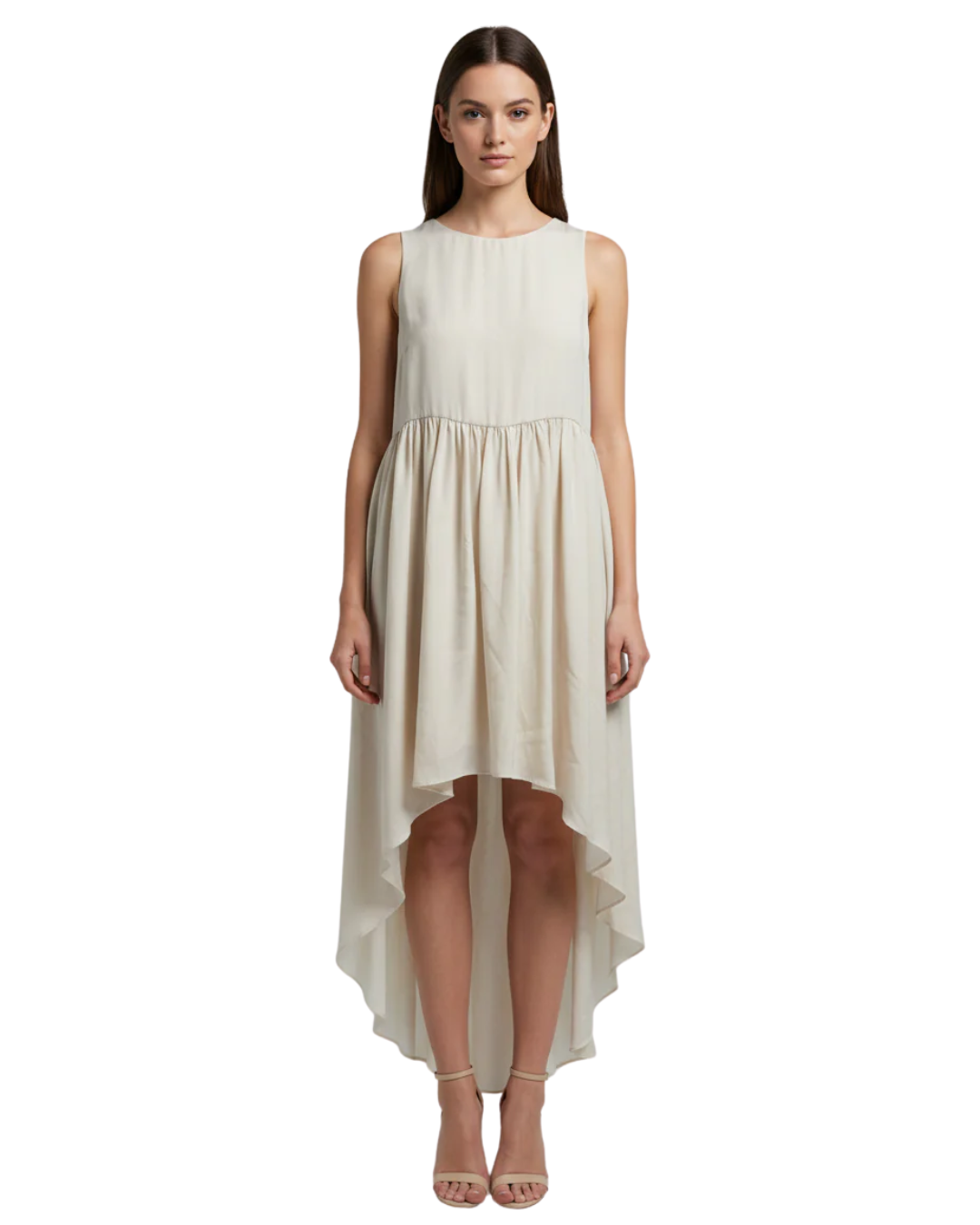 Embrace effortless elegance with this stunning sleeveless dress. Featuring a sophisticated high-low hemline and a gracefully gathered waist, it offers... Read more