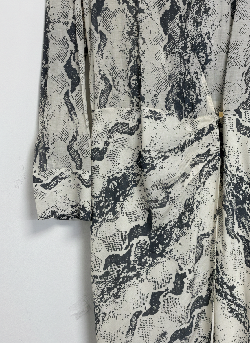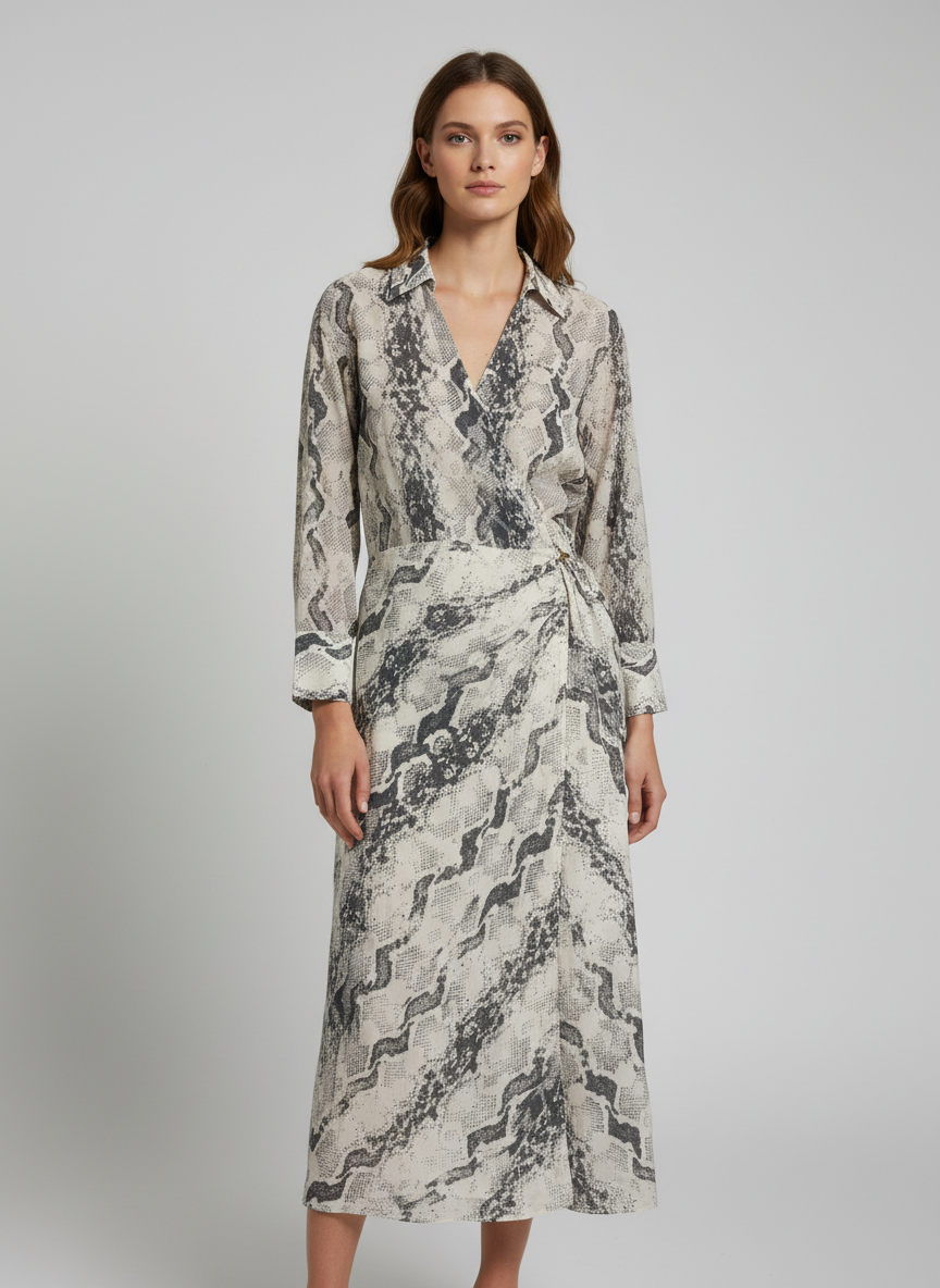 Embrace a bold aesthetic with this sophisticated snakeskin print midi dress. Designed with a classic wrap silhouette and a structured... Read more