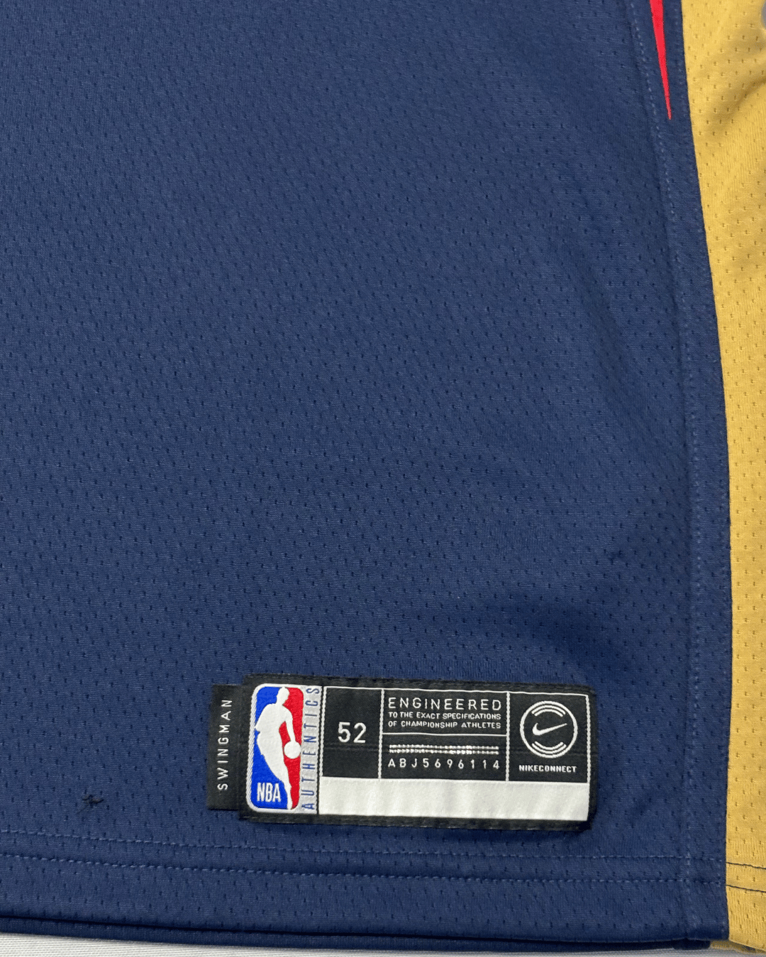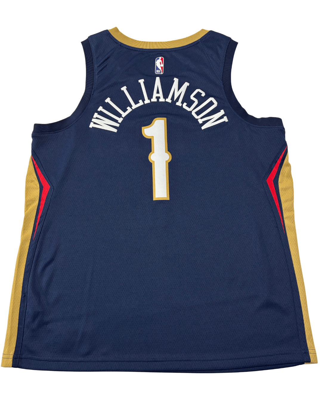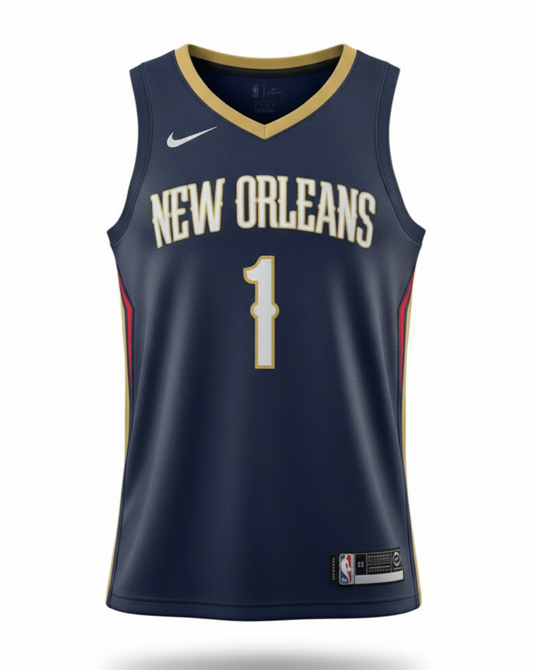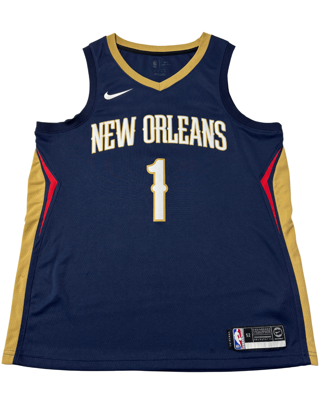 Show your support for the New Orleans Pelicans with this striking Zion Williamson #1 Icon Edition Swingman Jersey. Crafted with Nike's signature Dri-FIT technology, this jersey ensures you stay dry and comfortable whether you're on the court or cheering from the stands. The deep navy blue base is accented with bold gold lettering and trim, along with subtle red details on the sides, creating a dynamic and iconic look. Designed for basketball, this jersey features an extended length, typical for authentic player apparel. Perfect for any NBA enthusiast, this unique piece is in excellent condition.