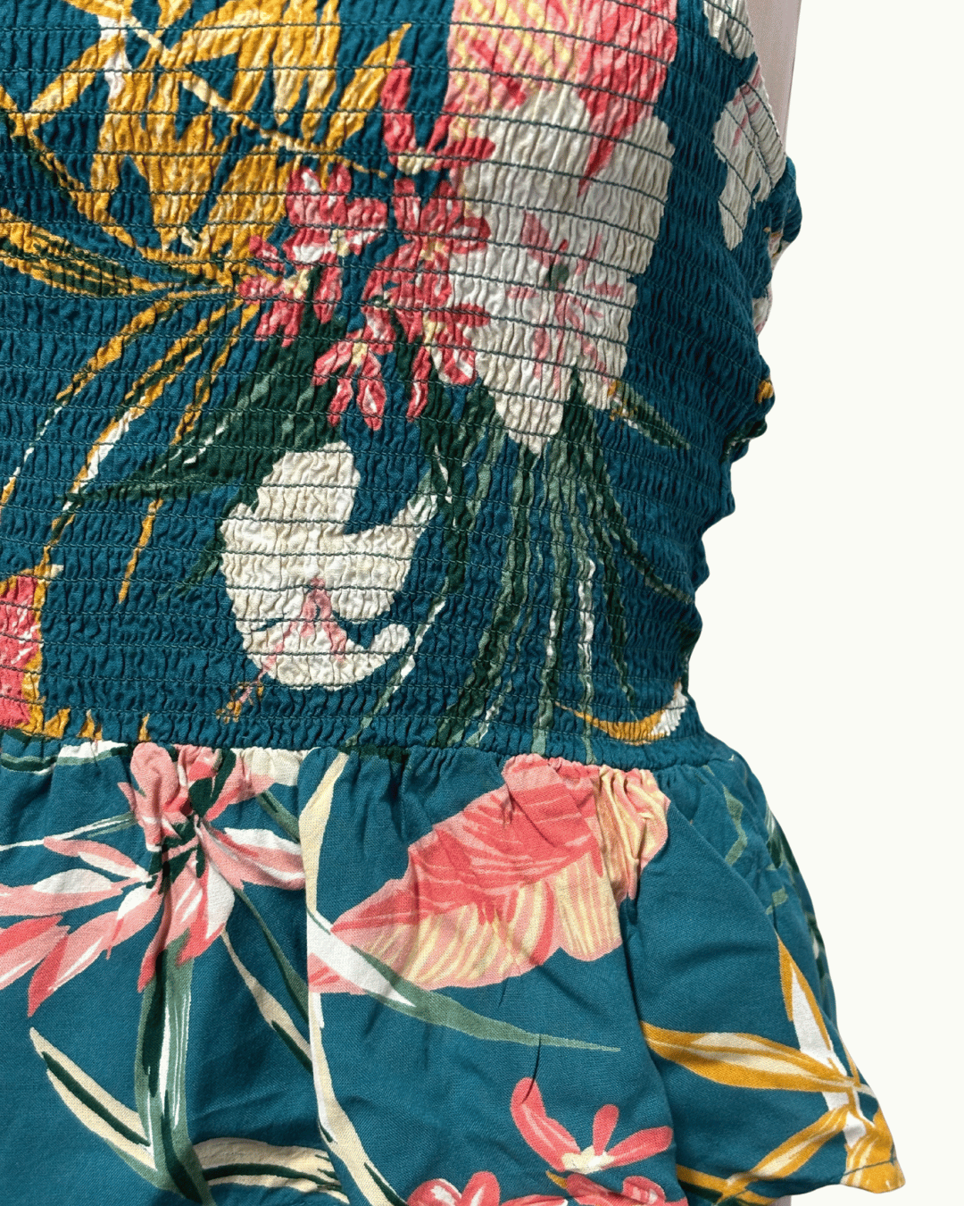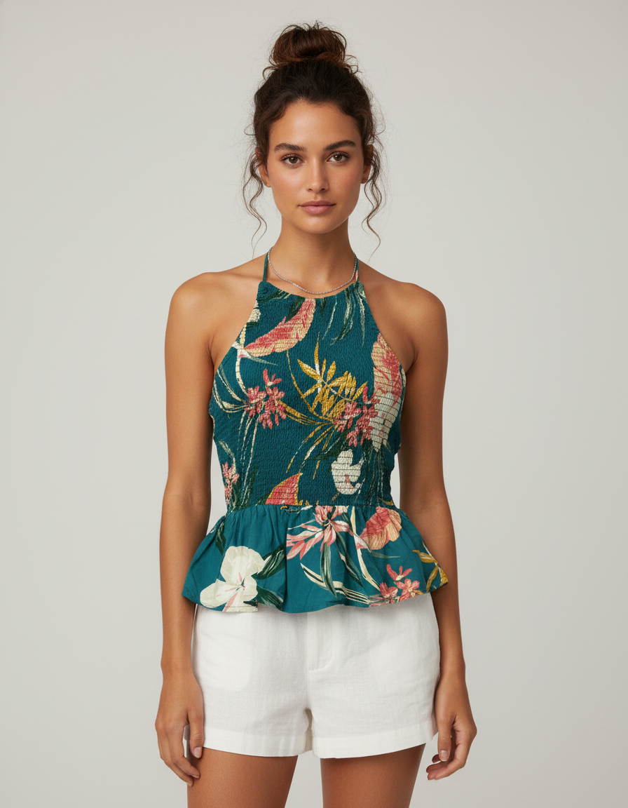 Patrons of Peace Tropical Floral Teal Halter Peplum Top