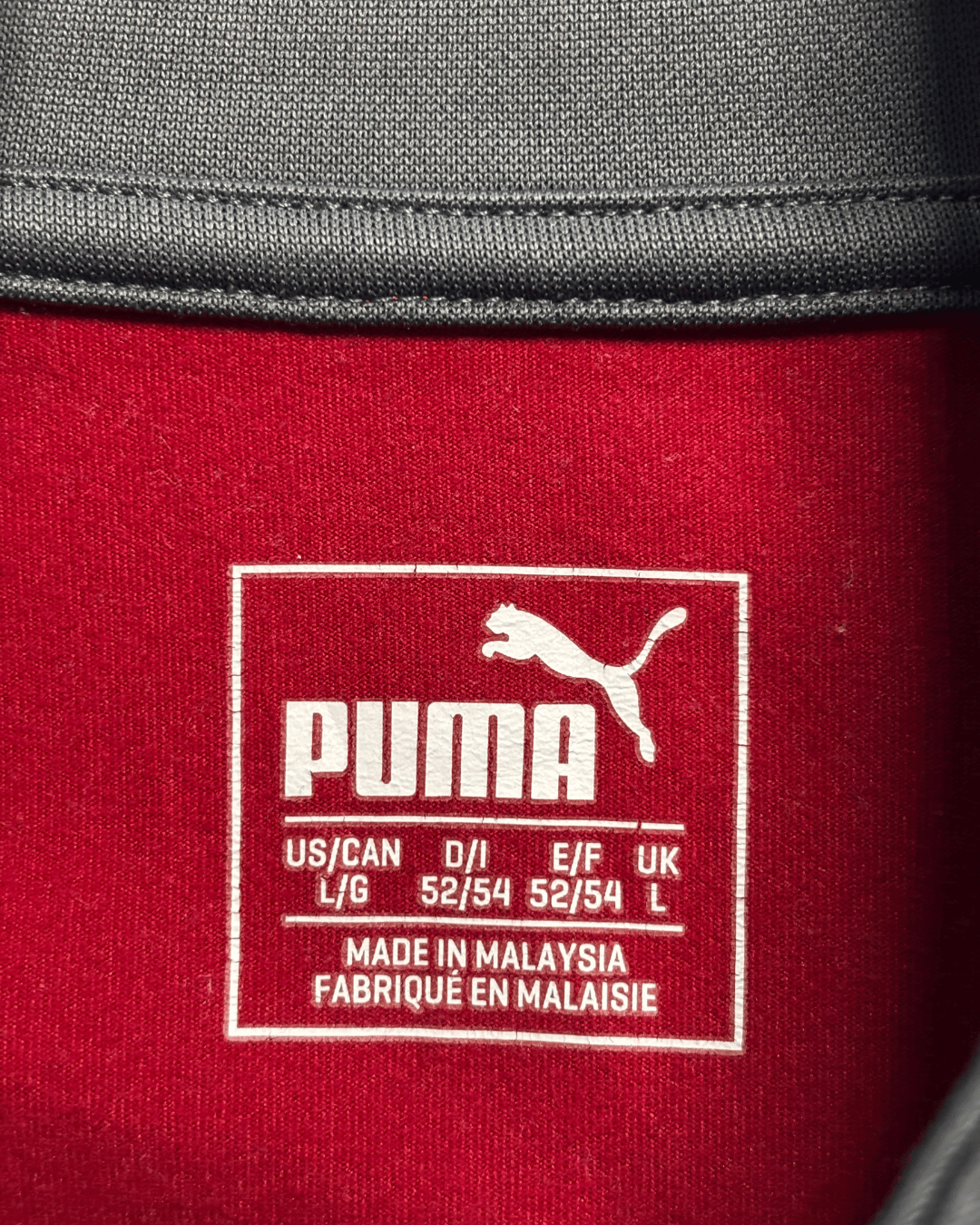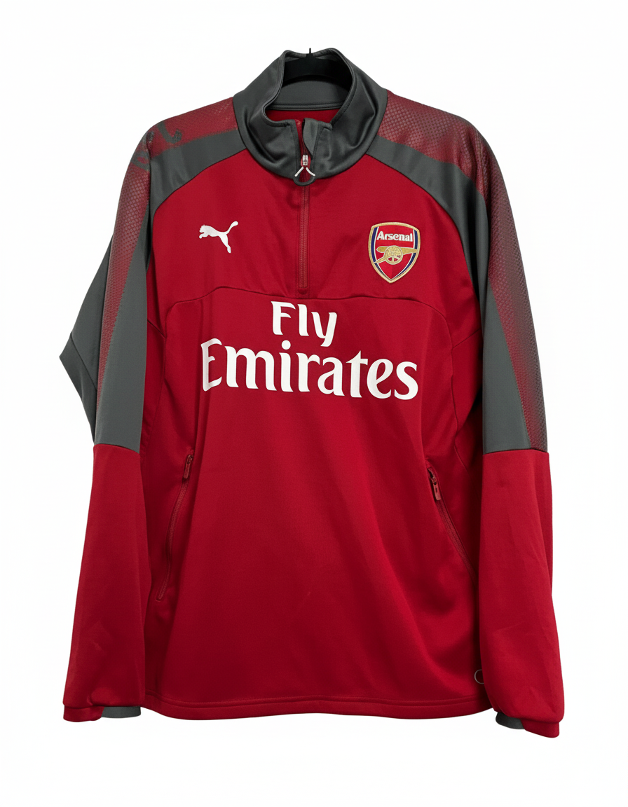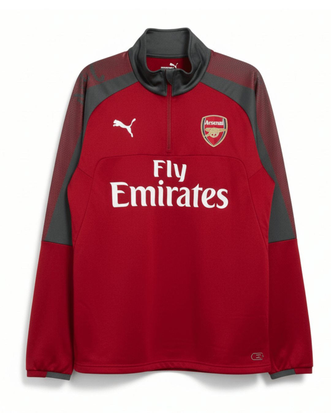 Upgrade your athletic wardrobe with this official Puma Arsenal FC 1/4 Zip Sports Upper. This vibrant red training top features the iconic Arsenal club crest alongside the white Puma logo and Fly Emirates sponsor branding. Designed with performance in mind, it includes a quarter-zip collar for adjustable airflow and unique grey textured patterns on the shoulders and sleeves. Made from high-quality, moisture-wicking fabric, this top offers a comfortable fit for training sessions or casual wear. Perfect for any dedicated Gunners supporter looking for authentic team gear.