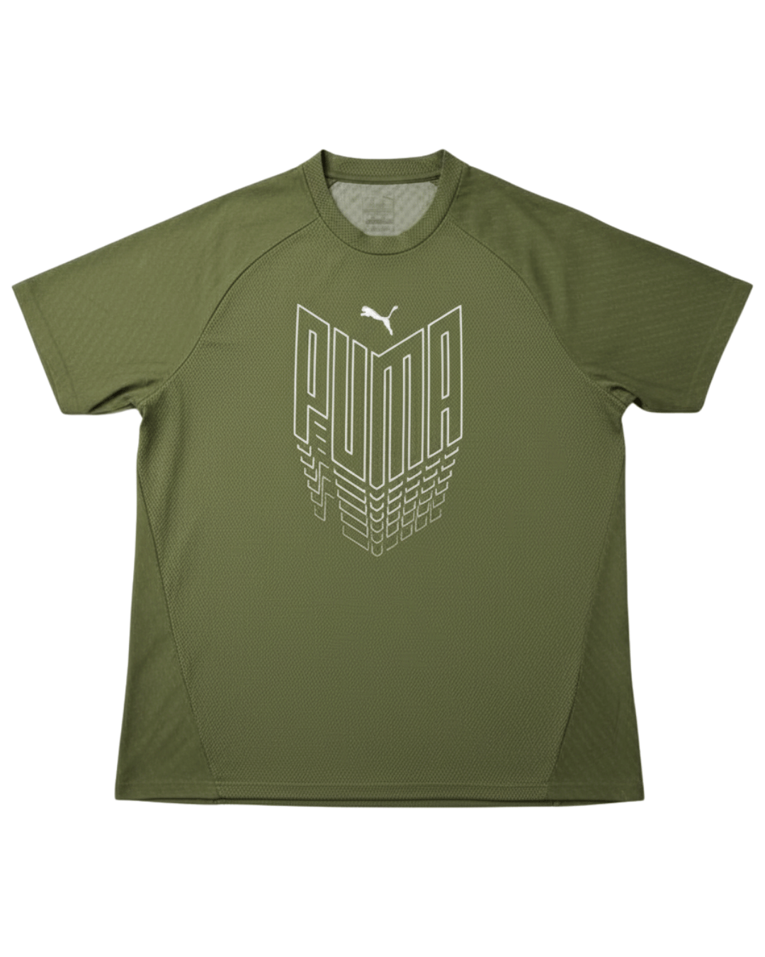 Elevate your athletic wardrobe with this unique PUMA DryCELL Performance Sports T-Shirt. Crafted in a stylish khaki green, this tee features a distinctive stacked PUMA logo graphic on the front, adding a modern, edgy touch. The breathable, textured performance fabric, enhanced with PUMA's DryCELL technology, actively wicks moisture away, ensuring you stay cool and comfortable during any activity. Mesh paneling on the sides further enhances ventilation. Perfect for training, casual wear, or making a statement, this piece is designed for peak performance and style.