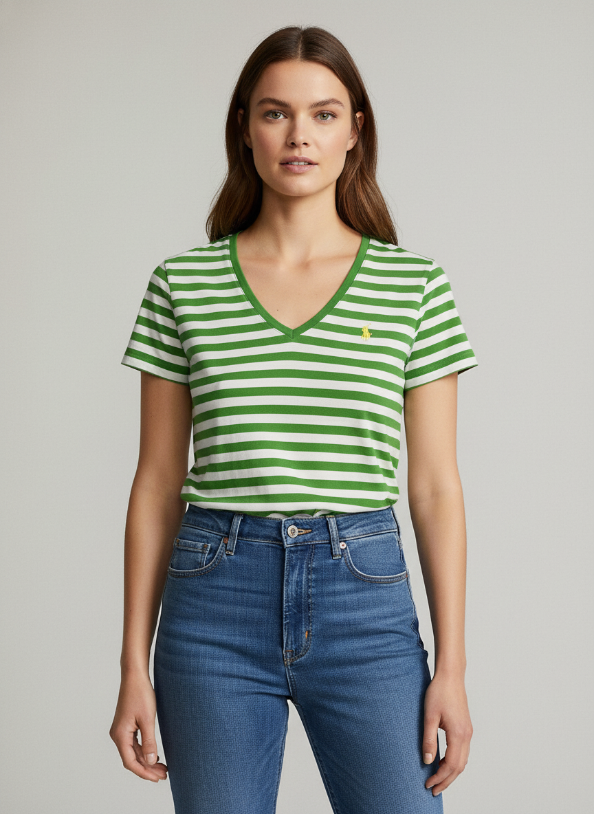 Ralph Lauren V-Neck Striped Green & White T-Shirt