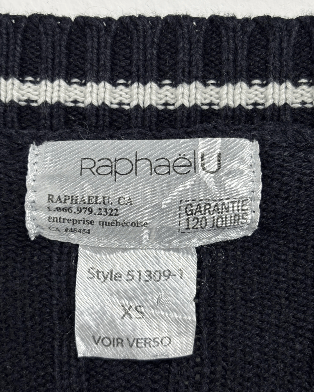 Discover timeless preppy style with this Raphaëlu cable knit V-neck sweater. Crafted in a rich navy blue, this classic piece... Read more