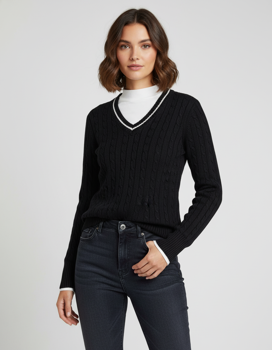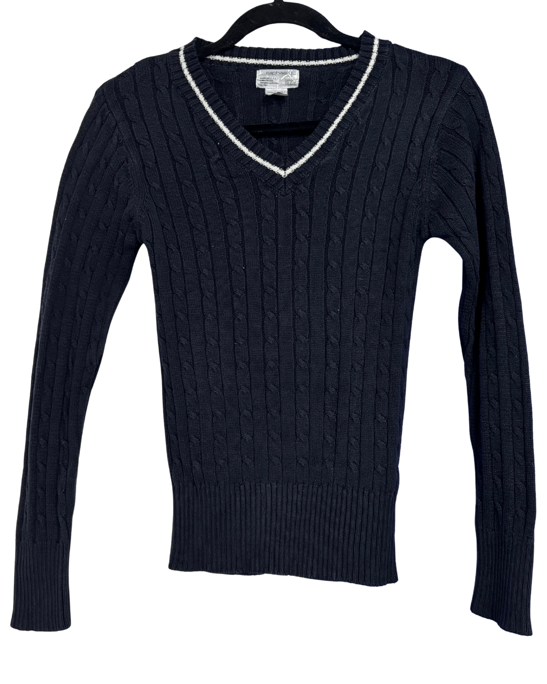 Raphaëlu Cable Knit Navy Blue V-Neck Sweater