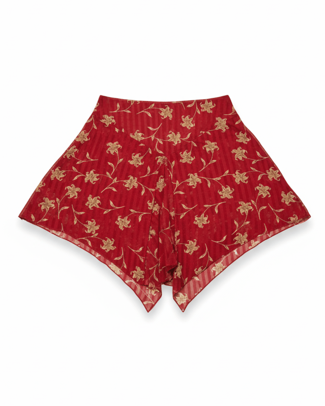 Embrace a whimsical and bohemian aesthetic with this stunning red floral skirt. Featuring an intricate gold lily print over a... Read more