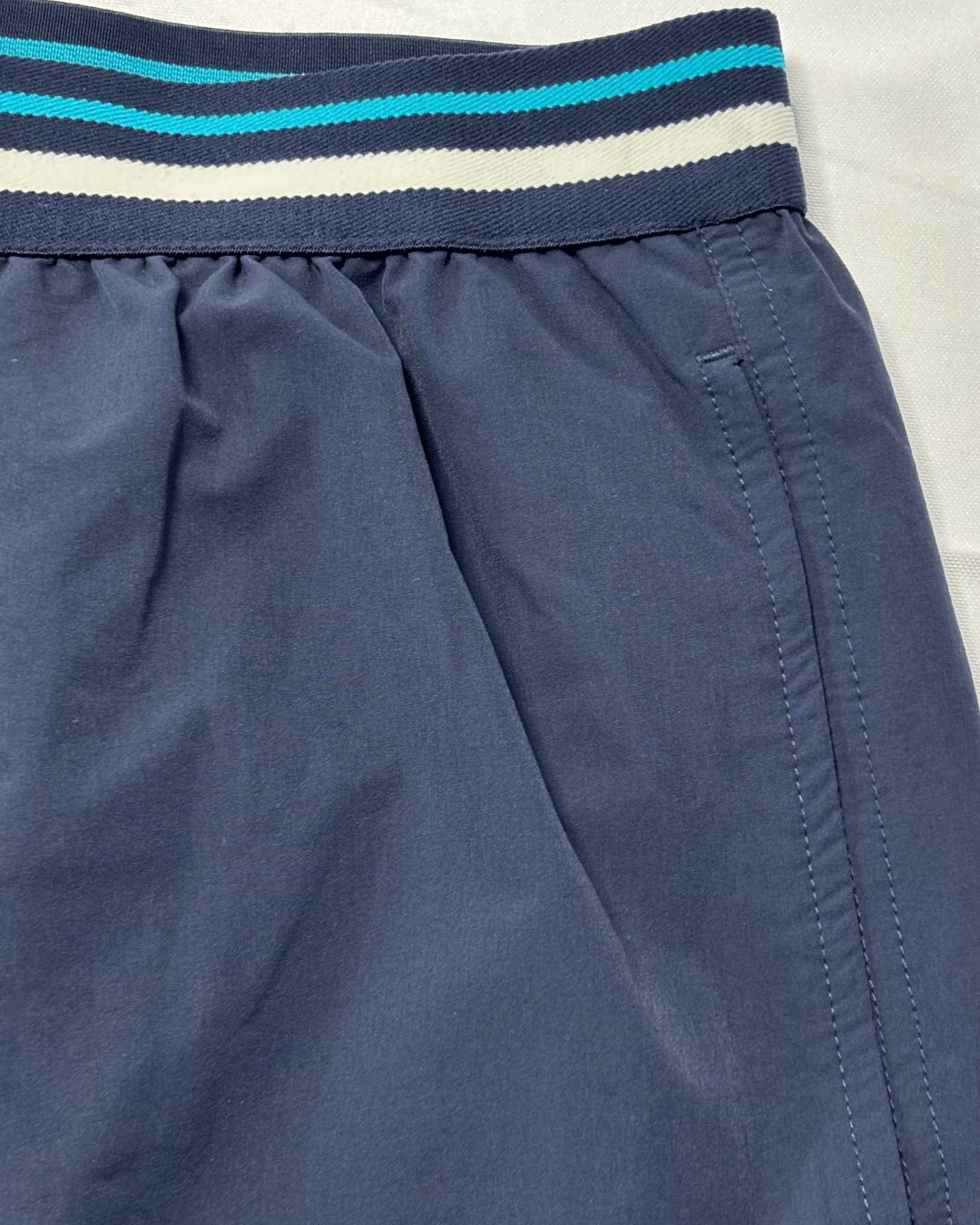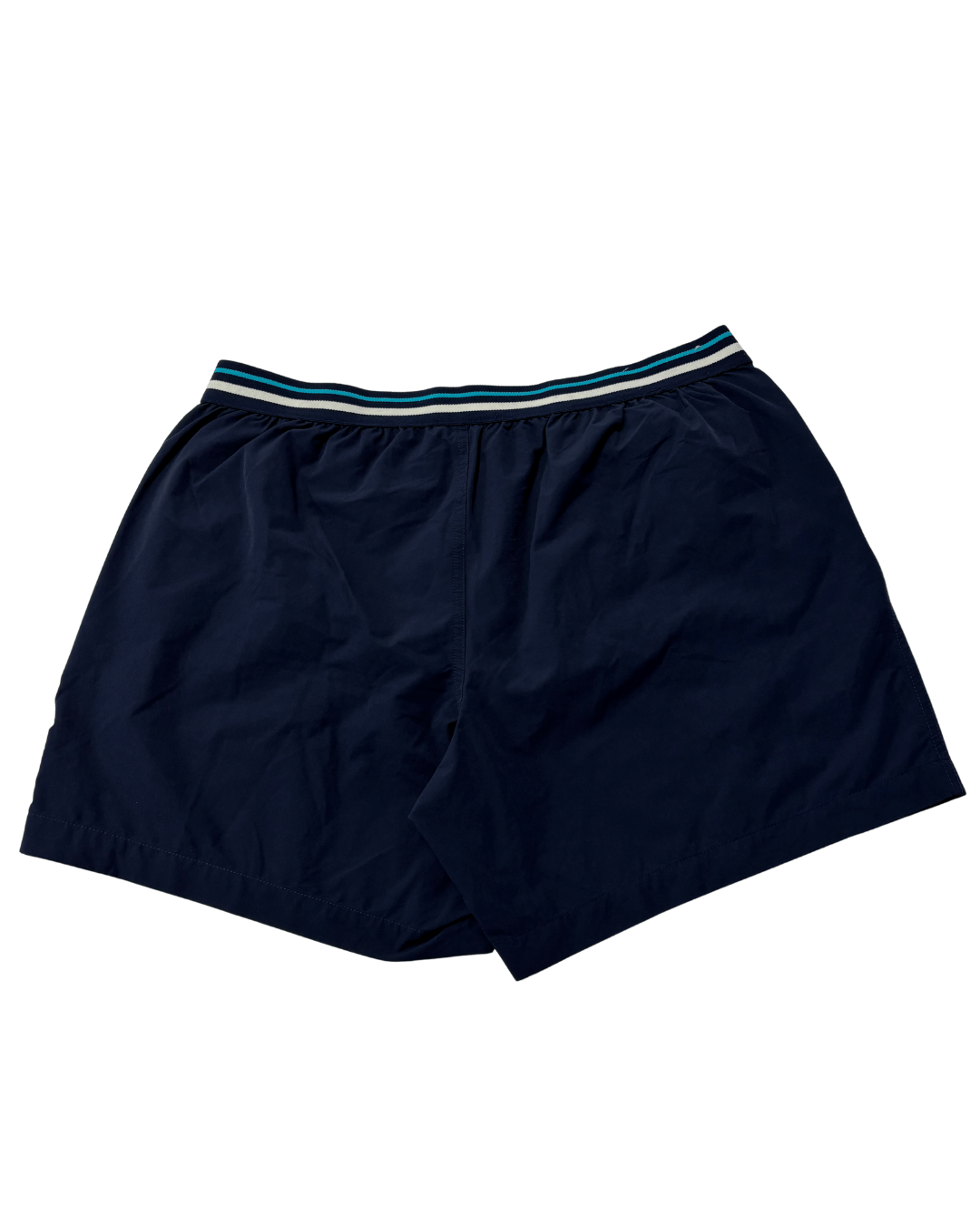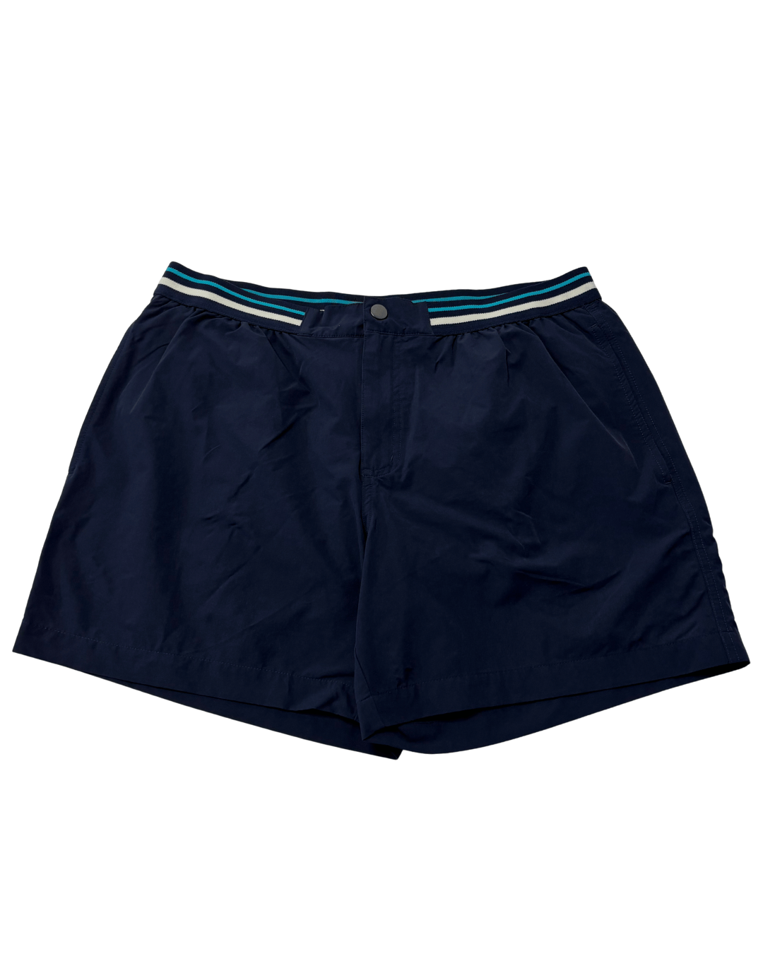 Discover these versatile Tchibo Men's Collection shorts, perfect for both athletic activities and casual wear. Crafted in a classic navy blue, these shorts feature a distinctive striped elastic waistband in white and teal, adding a touch of sporty style. The lightweight fabric is ideal for comfort and ease of movement, while the Mid Thigh / Athletic Cut provides a modern and functional fit. An excellent addition to any wardrobe, offering both practicality and understated style for the active individual.