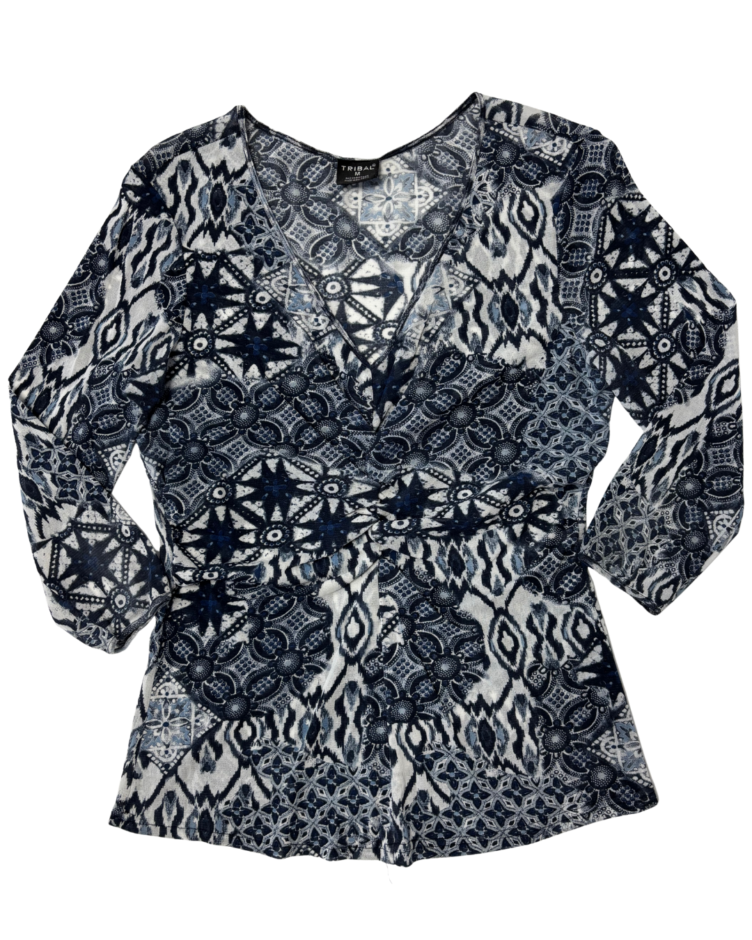 Elevate your everyday style with this vibrant TRIBAL top featuring a stunning blue and white patterned print that resembles ikat... Read more