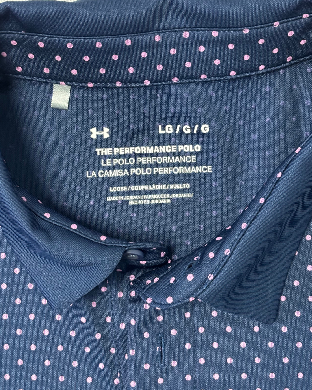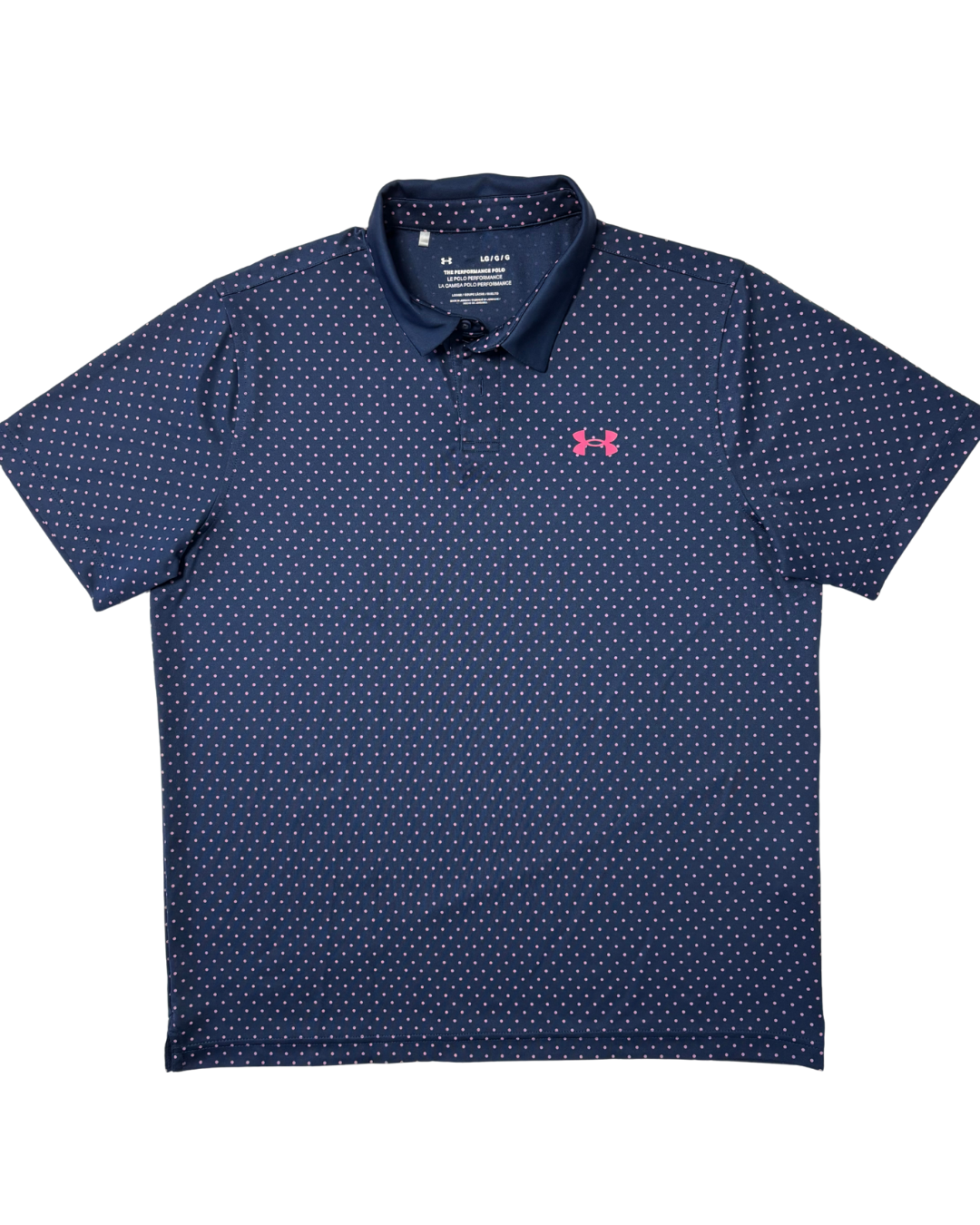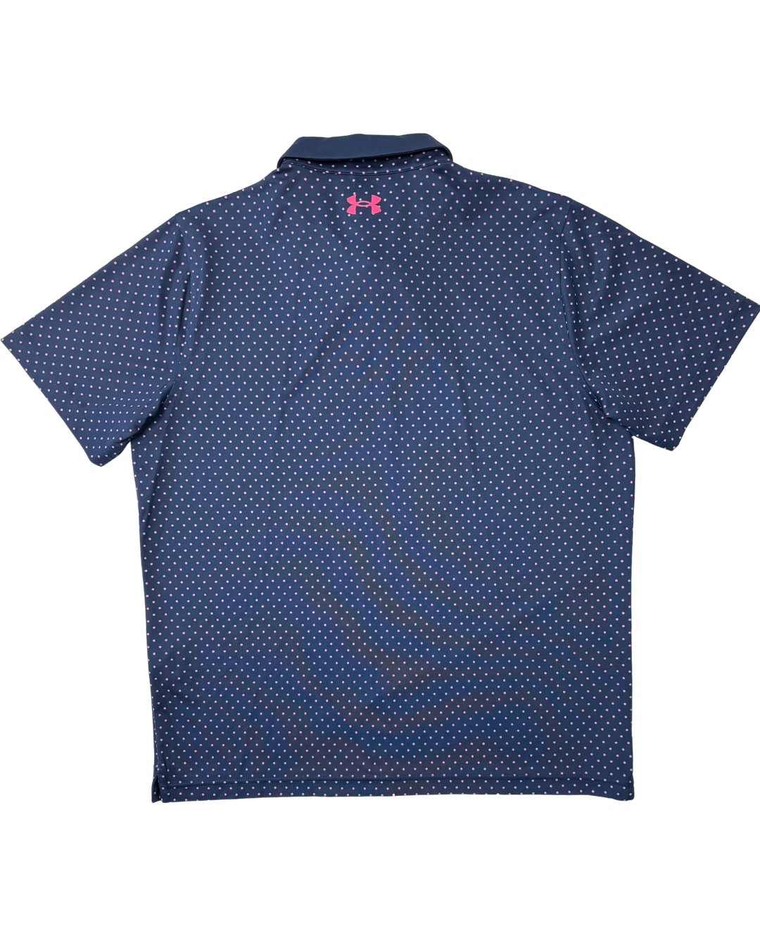 Product form Under Armour Navy Blue & Pink Polka Dot Performance Polo Shirt Measurements (inches) Pit to Pit: 22.5Length: 27.7Brand Size: L Dhs45.00 Quantity Add to cart Washed & Ready to WearFree shipping on all orders above 100 AEDNext day delivery