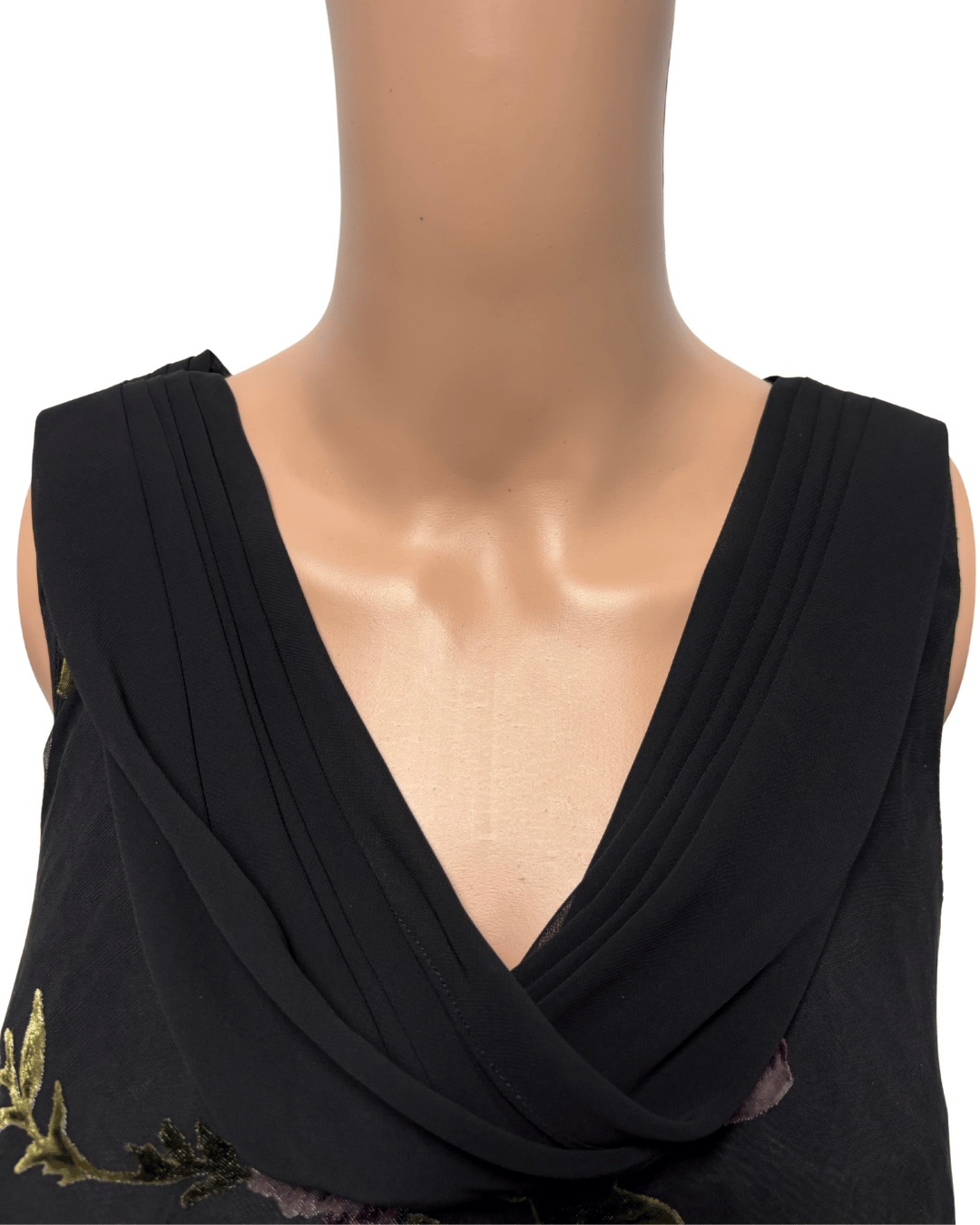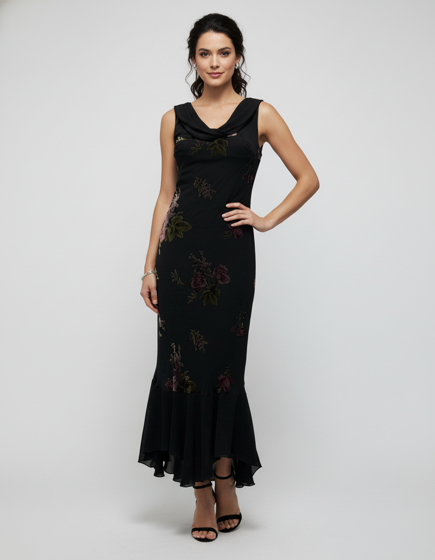 Make a graceful entrance in this vintage-inspired black midi dress featuring a soft cowl neckline and romantic velvet floral embroidery.... Read more