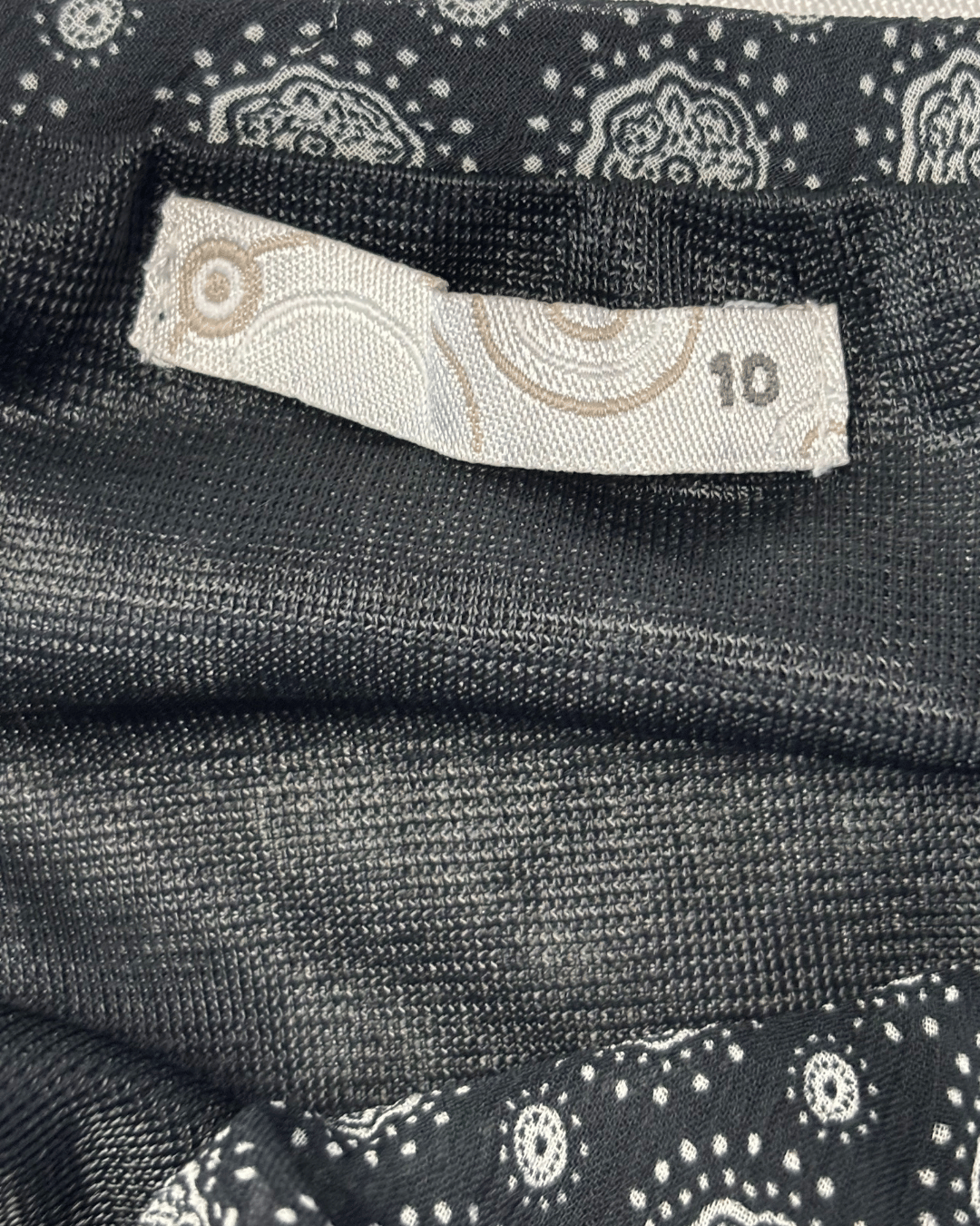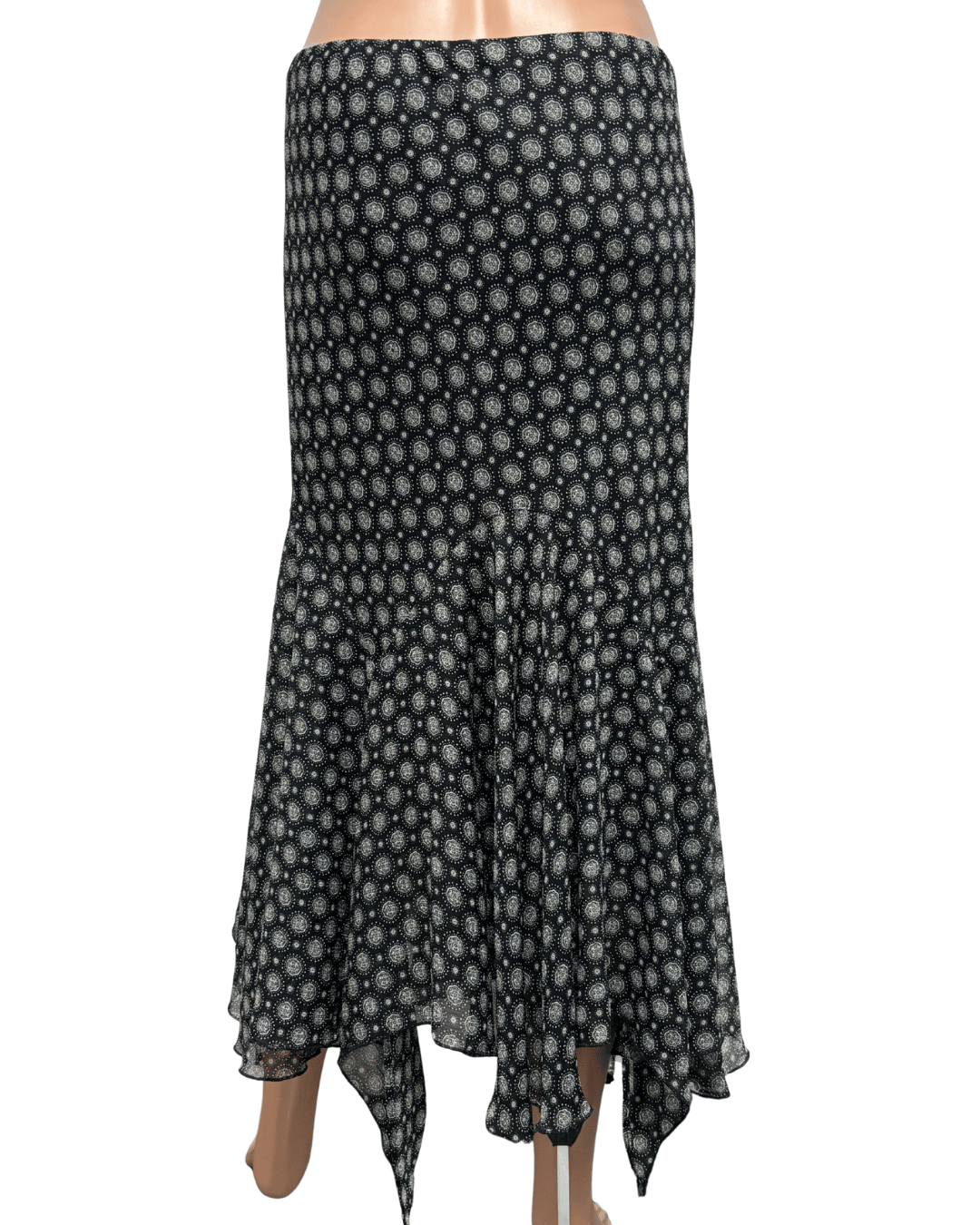 Add effortless flow to your wardrobe with this vintage boho-inspired black & white midi skirt. Featuring an asymmetrical handkerchief hem... Read more