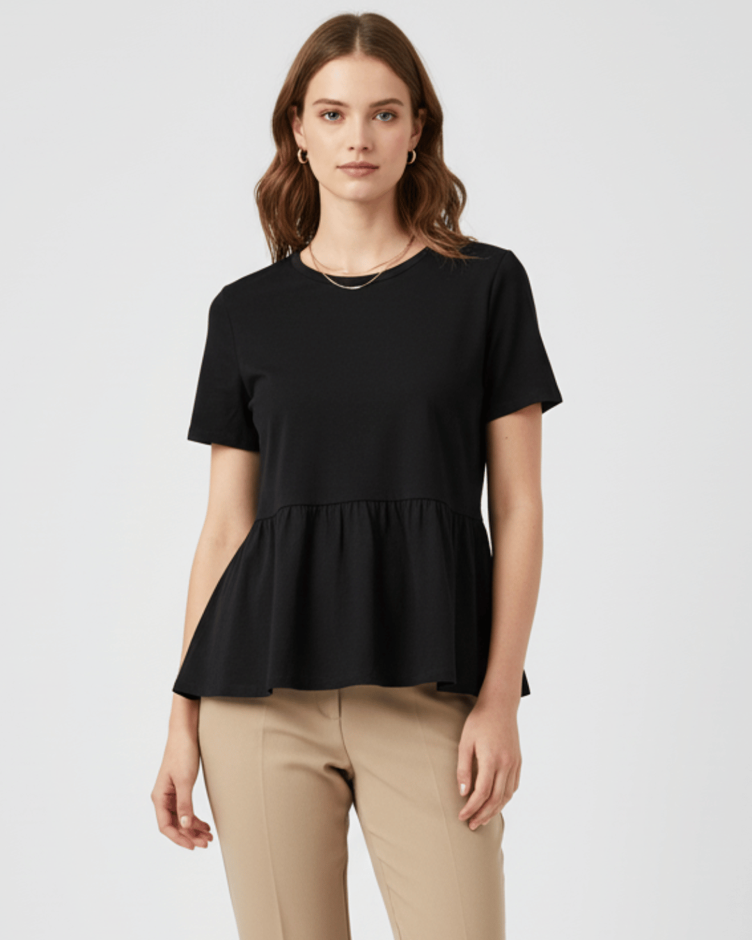 Add a touch of tailored flair to your casual wardrobe with this chic ZARA Black Peplum T-Shirt. This unique top... Read more